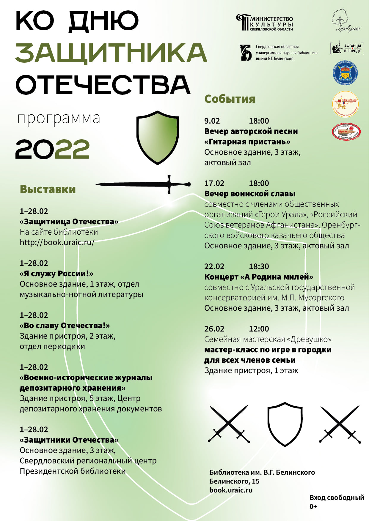 Свердловская областная универсальная научная библиотека им. В.Г. Белинского приглашает принять участие в мероприятия, посвященных Дню защитника Отечества