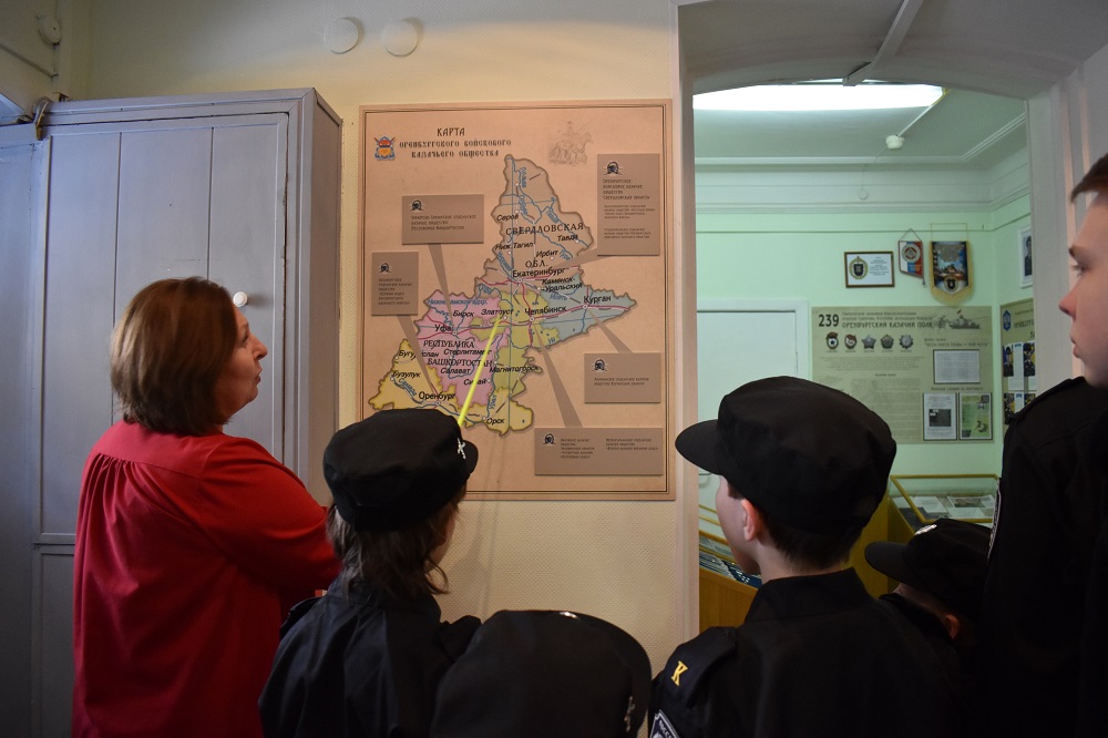 Воспитанники казачьего военно-патриотического клуба «Барс» в Екатеринбурге посетили экскурсию по штабу Оренбургского казачьего войска. Галина Илларионовна Ширшова, руководитель Центра казачьей культуры, рассказала молодежи об истории казачества на Урале и в России в целом.