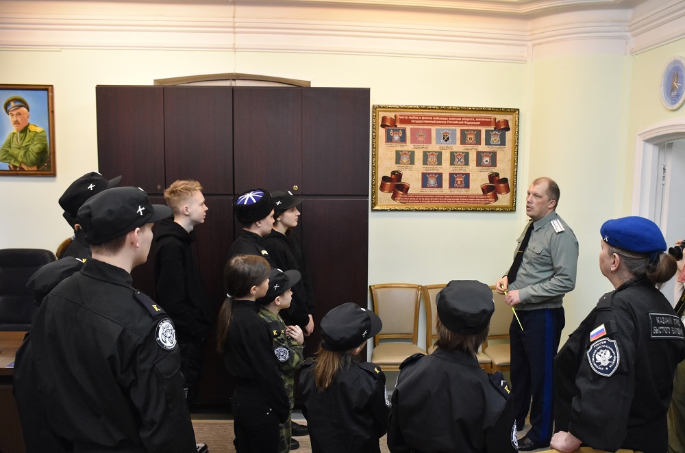 Интерес у детей вызвал кабинет войскового атамана казачьего генерала Владимира Ивановича Романова. Помощник войскового атамана Всеволод Александрович Митченко познакомил ребят с флагом войска и копией исторического знамени бывшего Оренбургского казачьего войска, существовавшего до 1918 года и изготовленного в 1991 году как символ возрождения.
