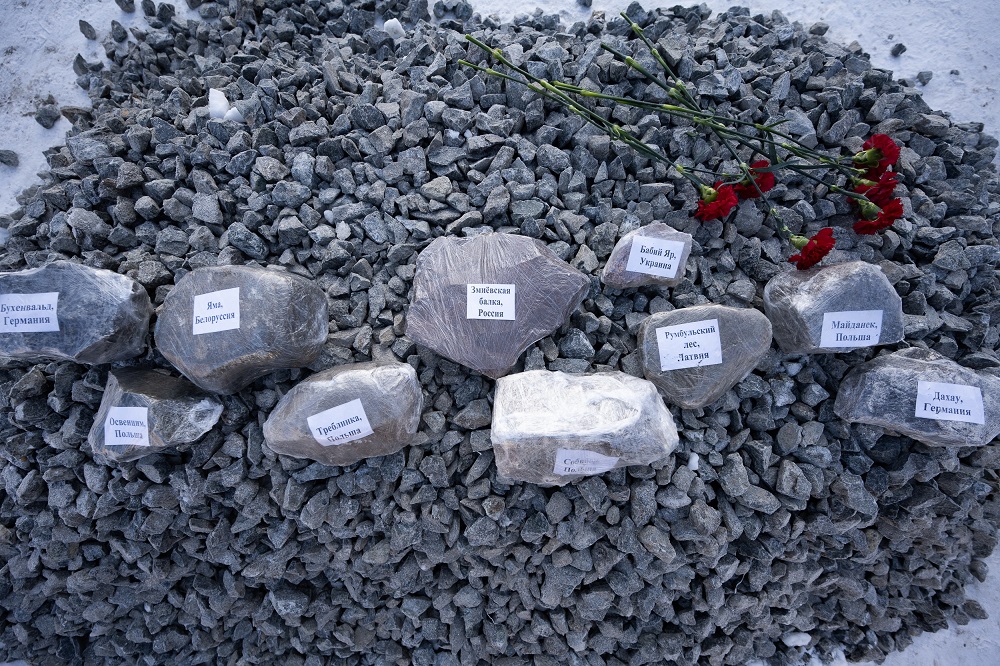 В соответствии с замыслом авторов идеи, сегодня перед Синагогой были заложены десять камней. Все они были специально собраны и привезены из бывших концлагерей и из мест гибели узников гетто: Освенцима, Треблинки, Собибора, Майданека, Бухенвальда, Дахау, Бабьего Яра, Румбульского леса, Ямы и Змиёвской балки. Камни станут в дальнейшем частью скульптурной композиции.