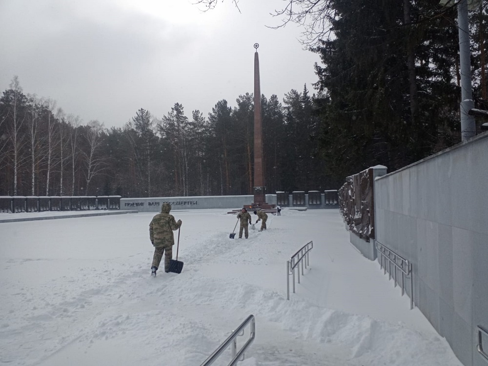 Перед прибытием автоколонны на Широкореченский мемориал казаки убрали обильно выпавший накануне снег, обеспечили проход к Вечному огню.