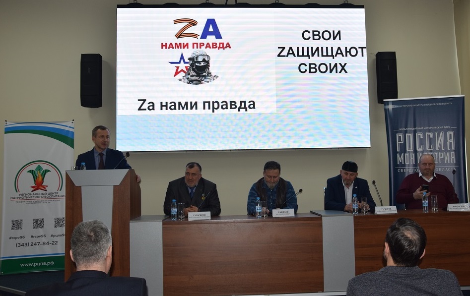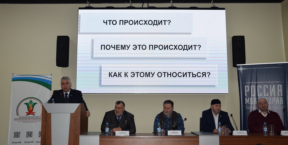 О причинах и перспективах спецоперации России по демилитаризации и денацификации Украины участникам мероприятия рассказали консультант отдела этноконфессиональных отношений и организации работы по профилактике экстремизма Департамента внутренней политики Свердловской области, кандидат философских наук, доцент, полковник полиции в отставке Суслонов Павел Евгеньевич, а также представители делегации общественных деятелей, историков и политологов из Чеченской Республики: Гучигов Сайпуддин Баудинович – председатель общественной организации «Наш дом город Грозный», эксперт Общественной палаты Чеченской Республики, член Союза журналистов России, краевед, инициатор и один из руководителей проекта по восстановлению информации о бойцах Красной Армии, погибших при защите г. Грозный от немецко-фашистских войск в 1942 г., захороненных на городском кладбище чеченской столицы; Мурдалов Муслим Махмедгириевич – кавказовед, этнограф, библиограф, научный сотрудник КНИИ (РАН) им. Х. И. Ибрагимова, главный библиотекарь Национальной библиотеки Чеченской Республики, заместитель председателя отделения Российского военно-исторического общества по Чеченской Республике, автор более 20 книг по истории Чечни, этнографии чеченского народа; Уздарбиев Абдул-Хамид Кутурбеевич – Член Общественной палаты Чеченской Республики, руководитель регионального Союза ветеранов Афганистана локальных войн и военных конфликтов и РО ООО военных инвалидов “ВоИн”; Сайдаев Ислам Вахаевич – политолог, журналист, общественный деятель, член Союза журналистов России, член Российского Военно-исторического общества, сопредседатель Чеченского отделения Союза историко-просветительских обществ “Наследие Империи”, помощник председателя Общественной палаты Чеченской Республики, заместитель директора Национального агентства Чеченской Республики по связям с соотечественниками “Орца” (Помощь), Эксперт по противодействию экстремизму и терроризму, автор ряда книг и научно-публицистических работ по истории и этнографии народов России и Кавказа.