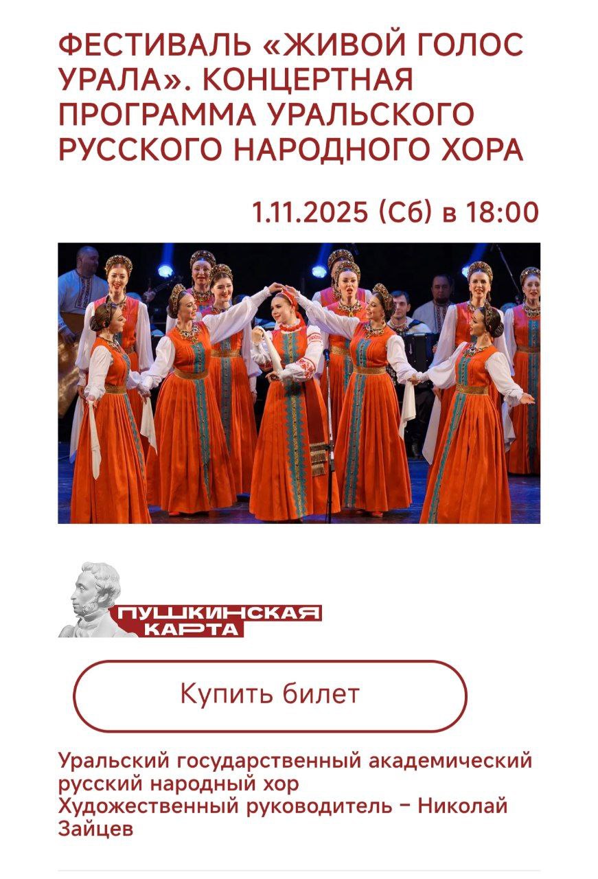 1 ноября 2025 года в 18.00 в концертном зале им. Лаврова пройдет сольный концерт Уральского хора с программой «Берегите Россию» в рамках фестиваля «Живой голос Урала».