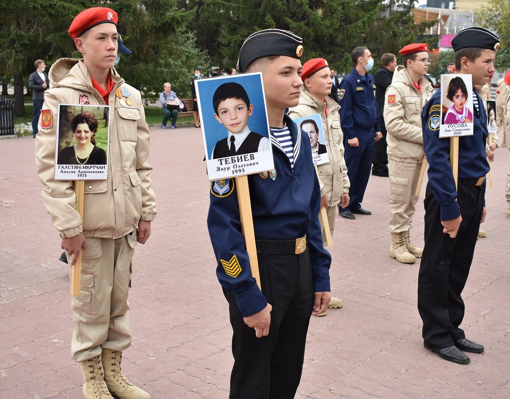 Вспоминая трагические события 17-летней давности, участники акции призвали к консолидации общества в борьбе с терроризмом. 334 фотографии детей и взрослых, погибших во время террористического акта в Беслане в руках курсантов, кадет и юнармейцев, стали еще одним напоминанием о тех трагических событиях.