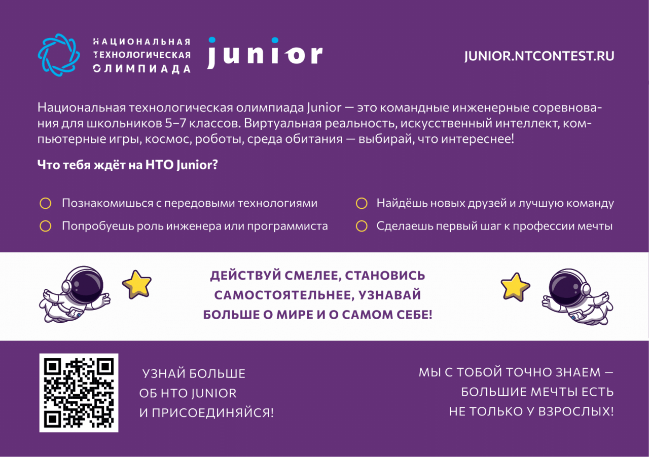 Команда победителей сможет отправиться на ежегодный Слёт «Национальной технической олимпиады» трека Junior в Москву, где ребята познакомятся с лидерами сферы, смогут погрузиться в самые интересные задания по направлениям олимпиады и попробовать на практике реальное высокотехнологичное оборудование.
