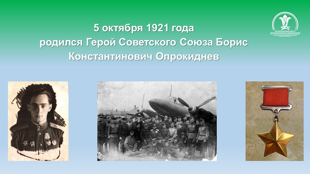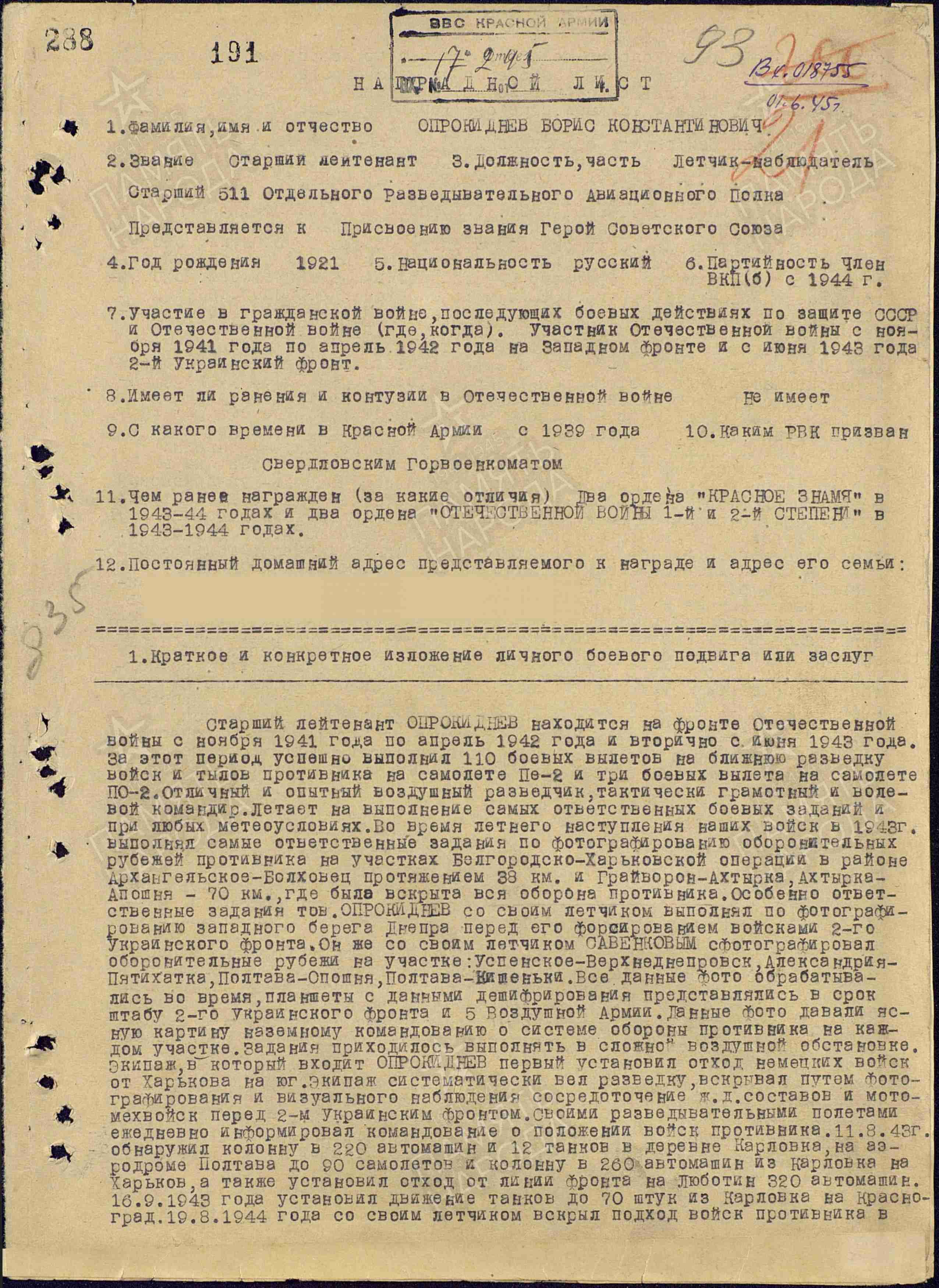 Старший лётчик-наблюдатель 511-го отдельного разведывательного авиационного полка (5-я воздушная армия, 2-й Украинский фронт) старший лейтенант Опрокиднев Борис Константинович к середине августа 1944 года выполнил 113 боевых вылетов на разведку войск, военных объектов и оборонительных сооружений противника. Сфотографировал 42 409 квадратных километров занятой врагом территории, сбросил свыше 1,6 миллиона листовок. В 5 воздушных боях экипаж сбил 1 истребитель врага.
