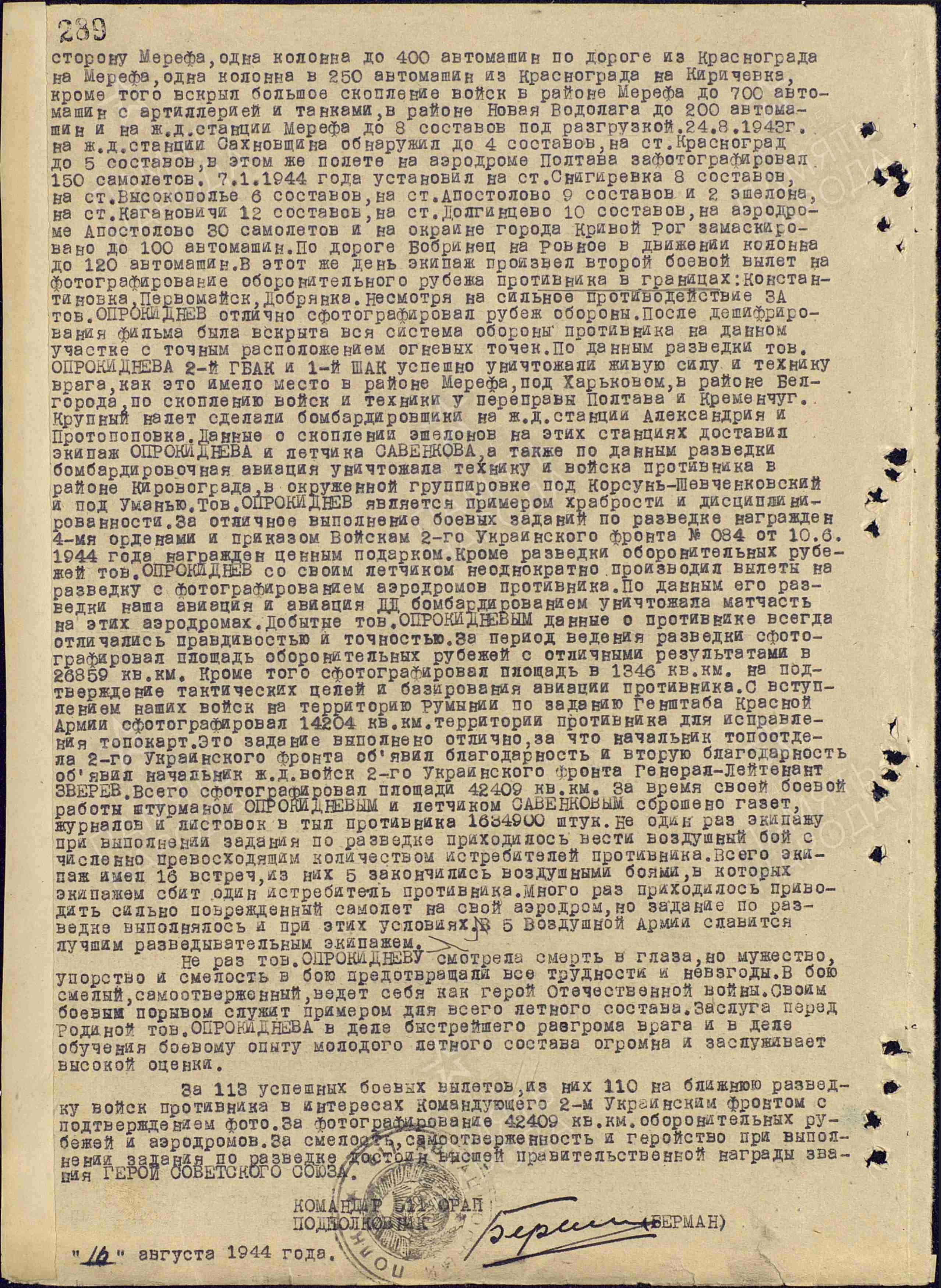 Особо помогли командованию ценные сведения. доставленные экипажем Опрокиднева-Савенкова в период боёв под Харьковом, при подготовке Одесской и Ясско-Кишиневской наступательных операций.