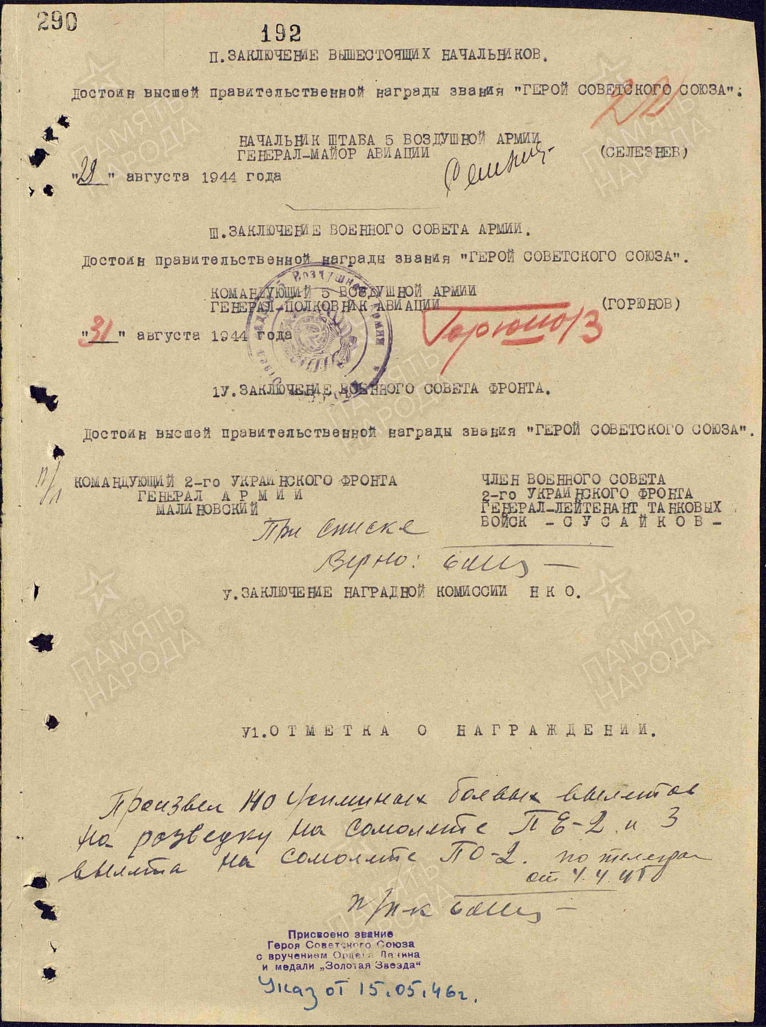 Представление командира полка к званию Героя Советского Союза было подписано 16 августа 1944 года, но указ о награждении был подписан с большой задержкой.
