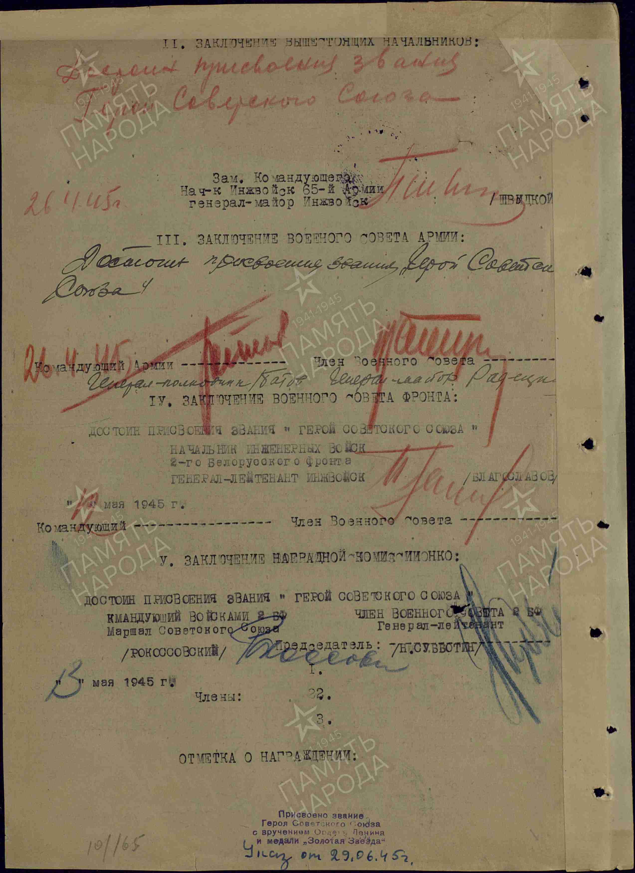 Имея большой опыт работы с техникой, быстро стал одним из лучших мотористов полка. В трудных фронтовых условиях всегда содержал в исправности свой катер ВМК-70, немедленно исправлял все его повреждения. При выполнении боевых задач отличался инициативностью и храбростью.