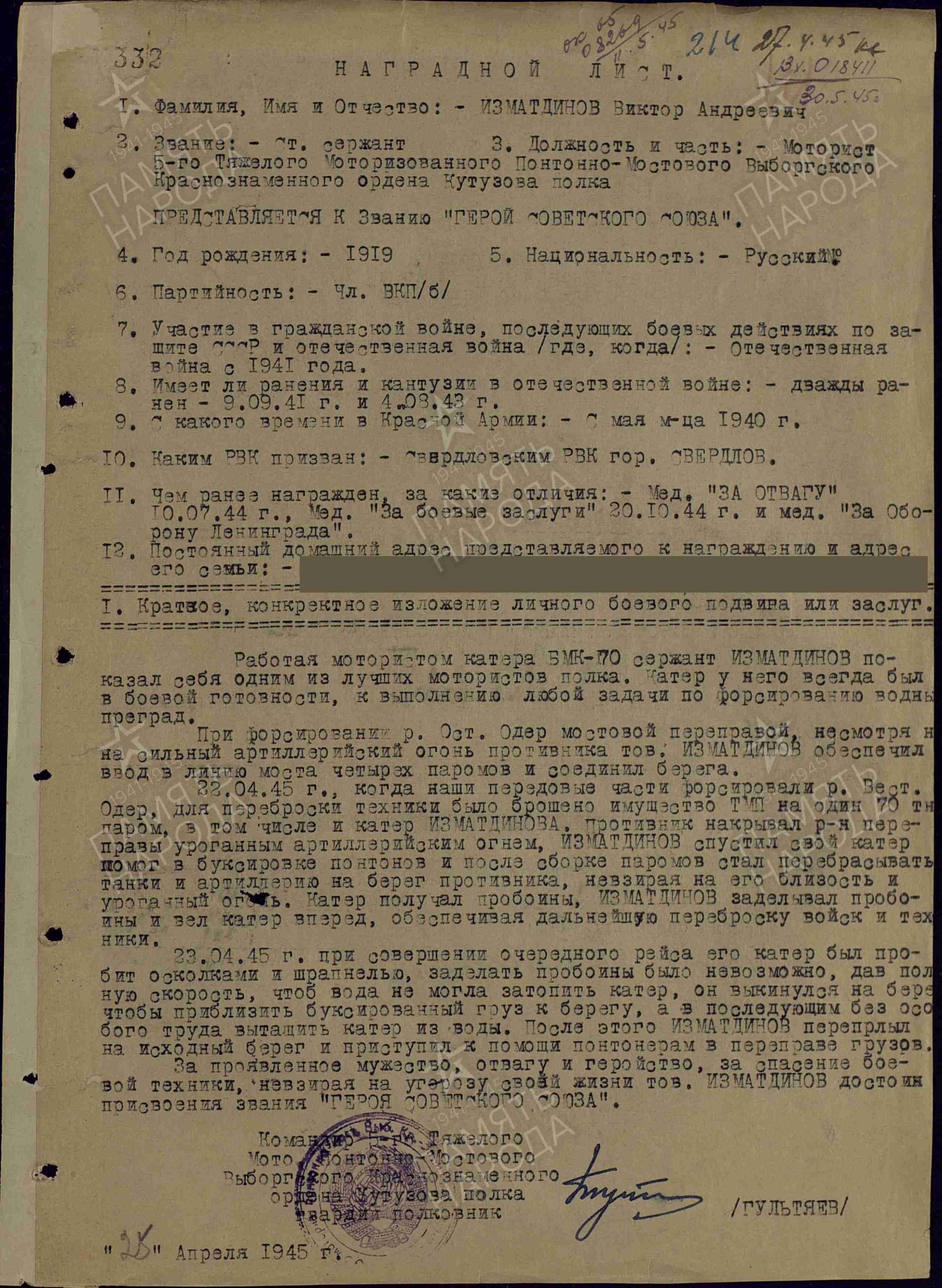 Моторист 5-го тяжелого моторизованного понтонно-мостового 65-й армии 2-го Белорусского фронта, старший сержант Измадинов Виктор Андреевич отличился в Берлинской наступательной операции. 22 апреля 1945 года при форсировании одного из рукавов Одера (Вест-Одер) южнее города Штеттин (ныне г. Щецин, Западно-Поморское воеводство, Польша) под непрерывным артиллерийско-миномётным обстрелом огнём обеспечил сборку понтонов и наведение понтонного моста: буксировал секции понтонов на место их установки на переправе. После выполнения этой задачи под обстрелом доставлял на баржах танки и артиллерию на занятый плацдарм.
