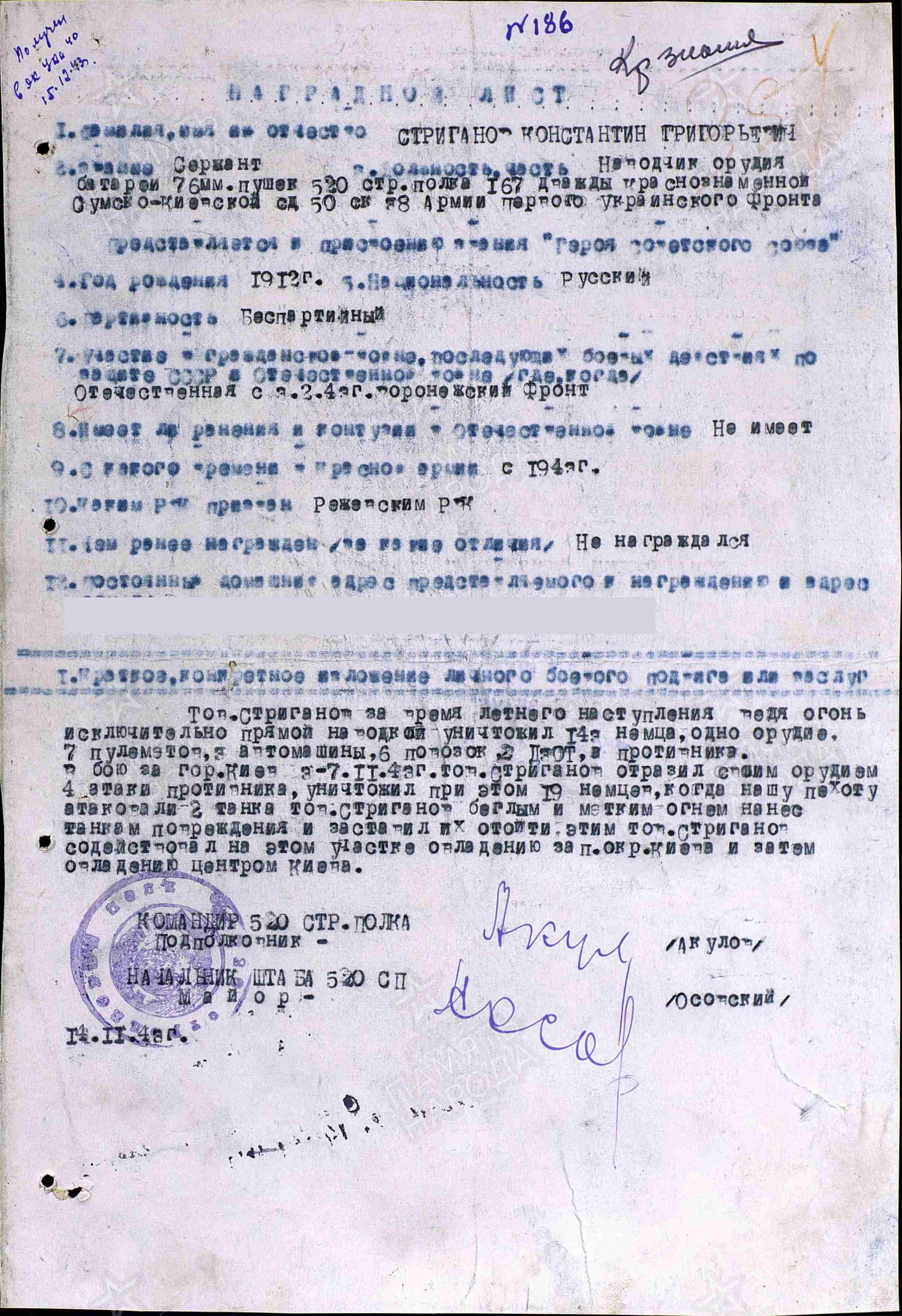 Стриганов Константин Григорьевич – командир орудия батареи 76-мм пушек 520-го стрелкового полка 167-й стрелковой дивизии 38-й армии 1-го Украинского фронта, сержант.