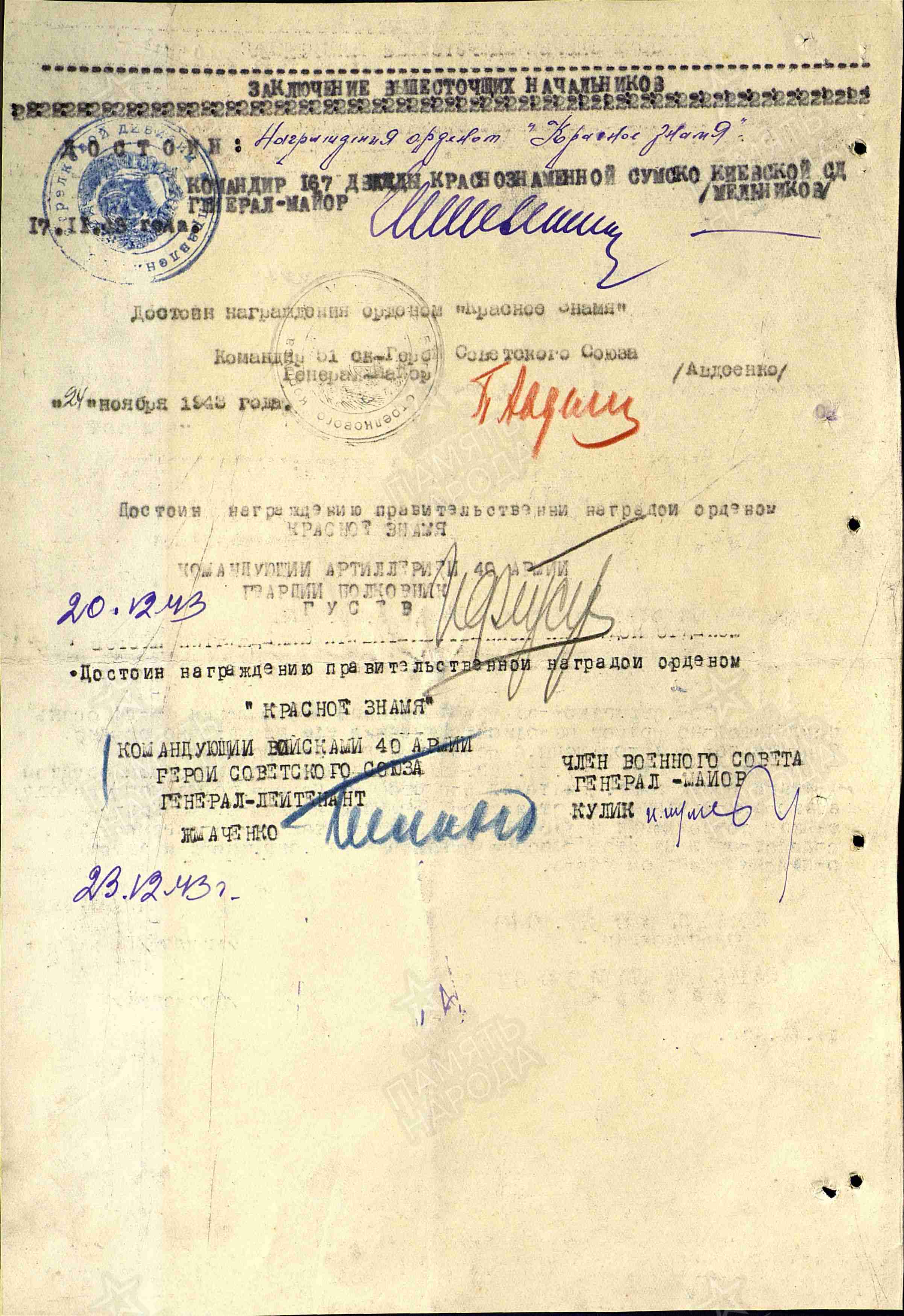 Награжден орденом Ленина (10.01.1944), орденом Красного Знамени (23.12.1943).