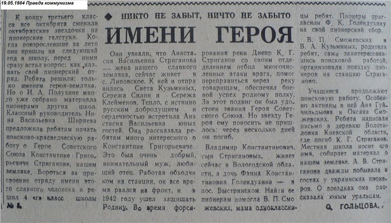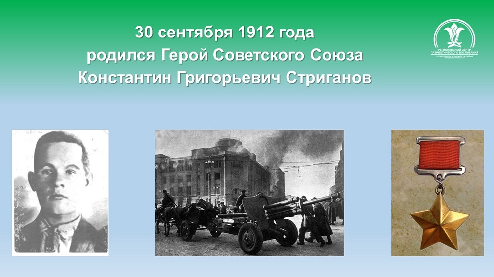 Указом Президиума Верховного Совета СССР от 10 января 1944 года за образцовое выполнение боевых заданий командования на фронте борьбы с немецкими захватчиками и проявленные при этом отвагу и геройство сержанту Стриганову Константину Григорьевичу присвоено звание Героя Советского Союза с вручением ордена Ленина и медали "Золотая Звезда".