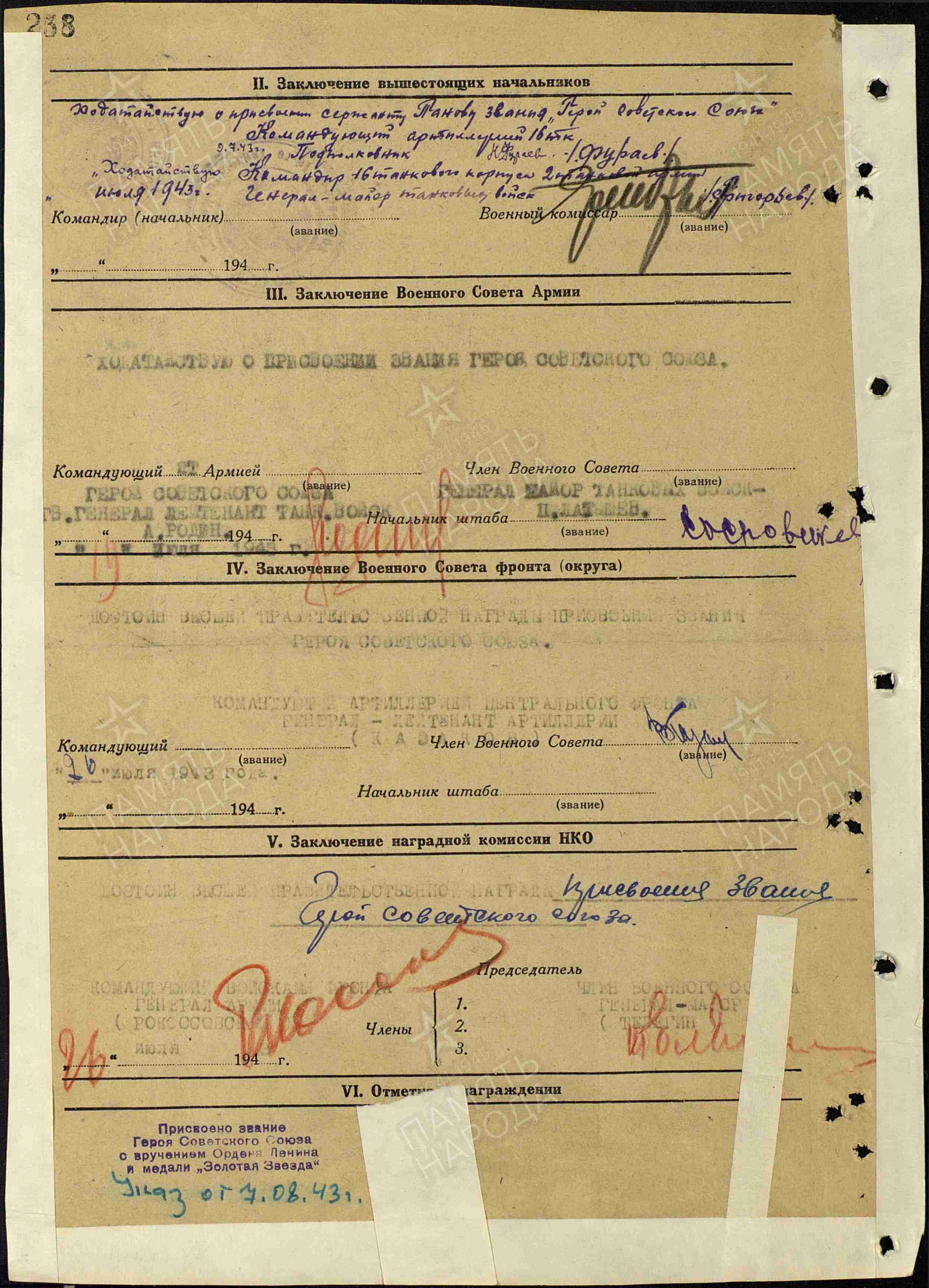 В этой яростной схватке расчет сержанта Петра Панова подбил и поджег в общем итоге одиннадцать танков противника, в том числе пять тяжелых - «тигров». Благодаря мужеству и стойкости артиллеристов танковая атака гитлеровцев захлебнулась. И тогда расчет Панова открыл губительный огонь по пехоте, уничтожив и рассеяв еще около двух батальонов гитлеровских солдат и офицеров, сохранив при этом свой состав полностью.