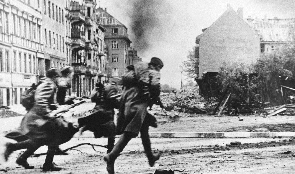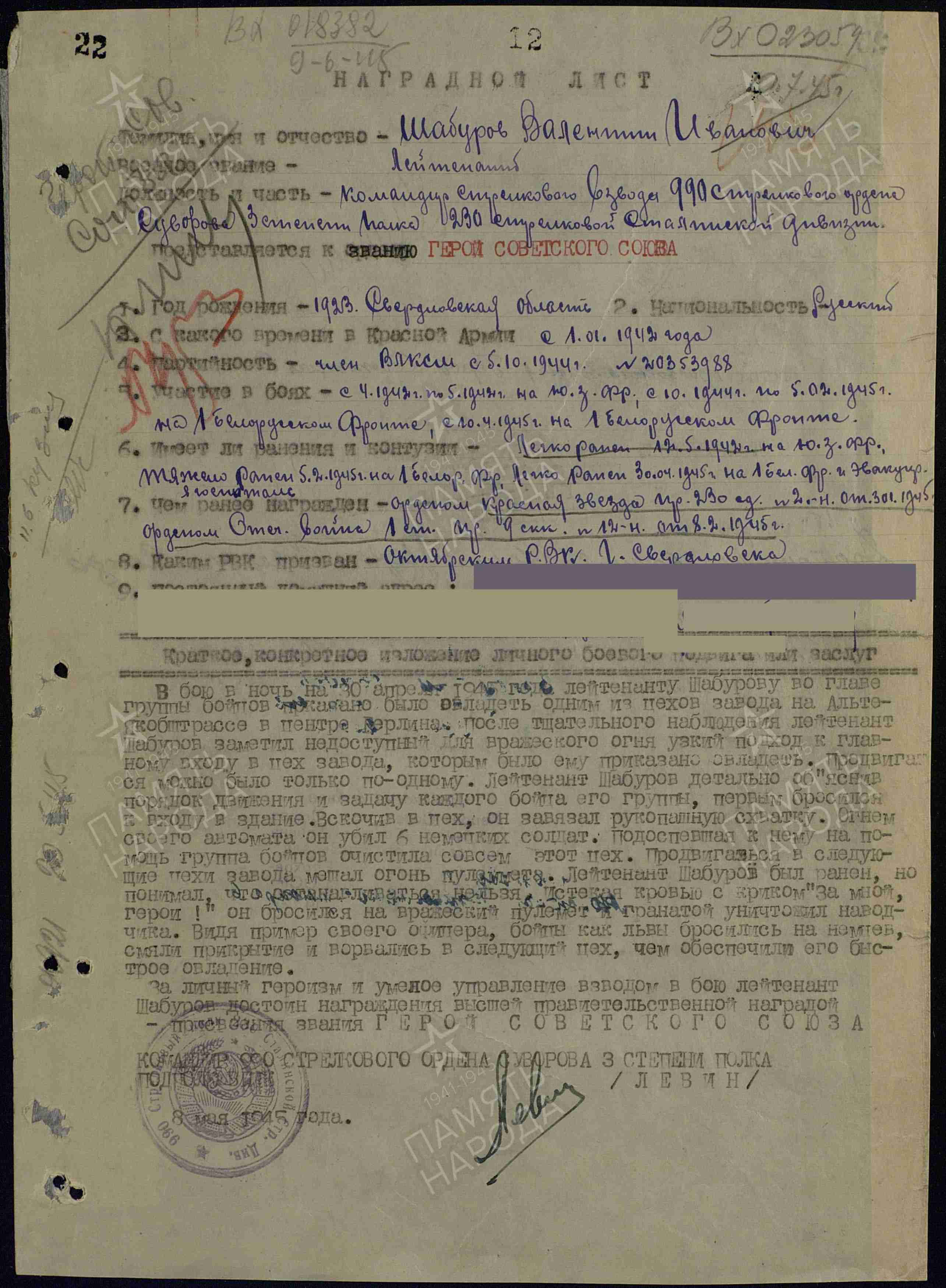 Командир взвода 990-го стрелкового полка (230-я стрелковая дивизия, 5-я ударная армия, 1-й Белорусский фронт) комсомолец лейтенант Шабуров В.И. отличился в уличных боях в столице гитлеровской Германии - Берлине.