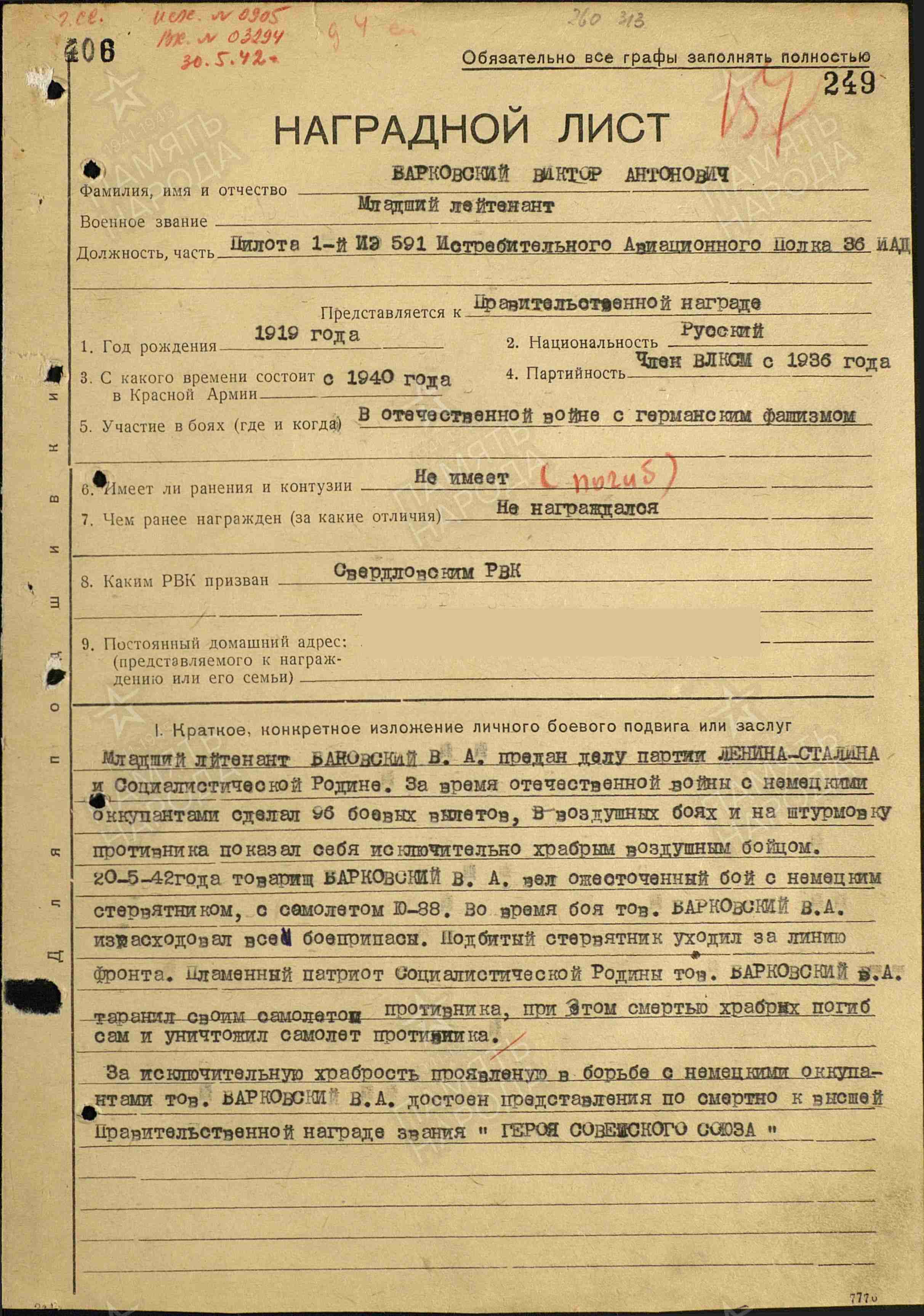 Барковский Виктор Антонович - лётчик 591-го истребительного авиационного полка (36-я истребительная авиационная дивизия, Войска ПВО территории страны), младший лейтенант.
