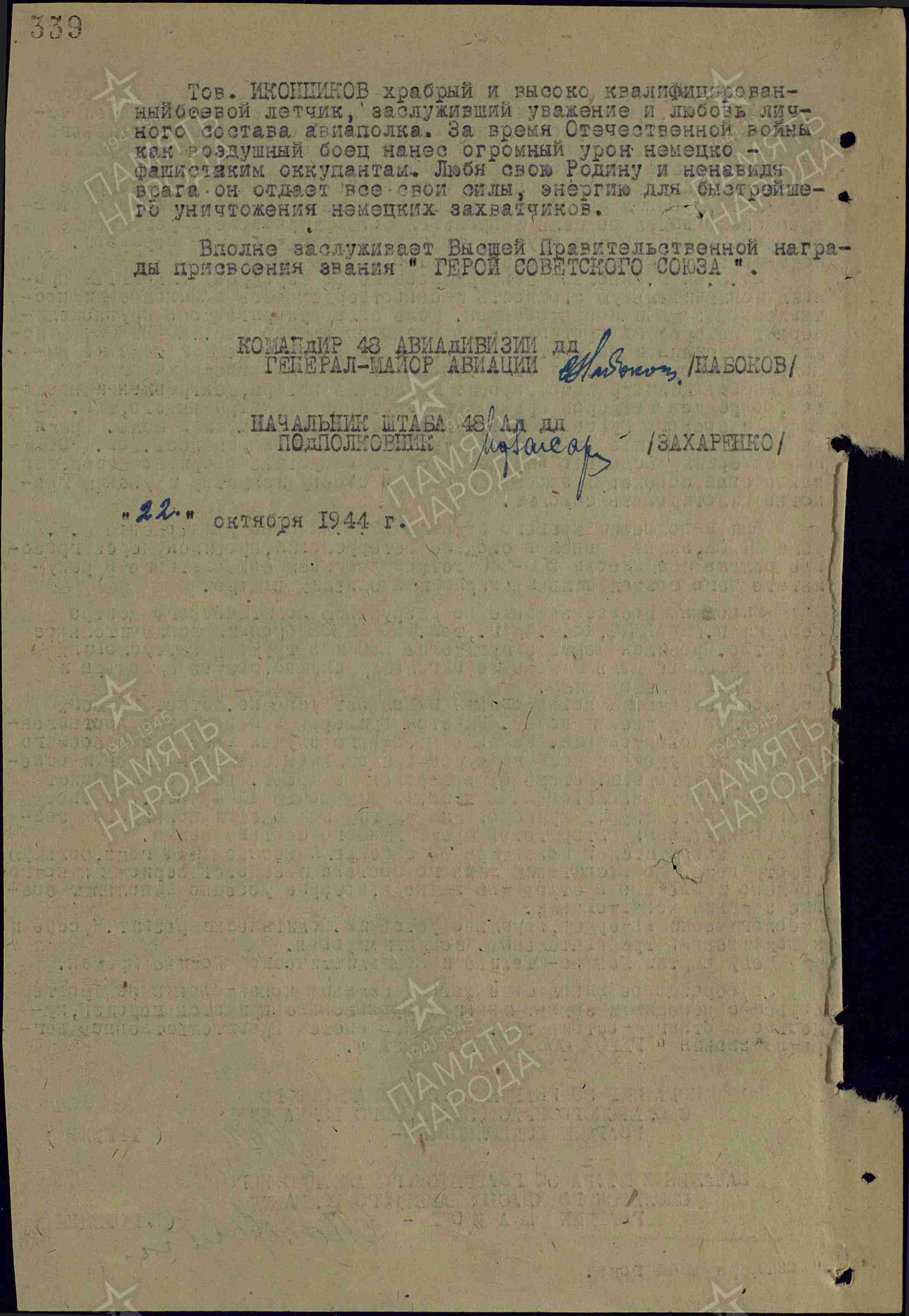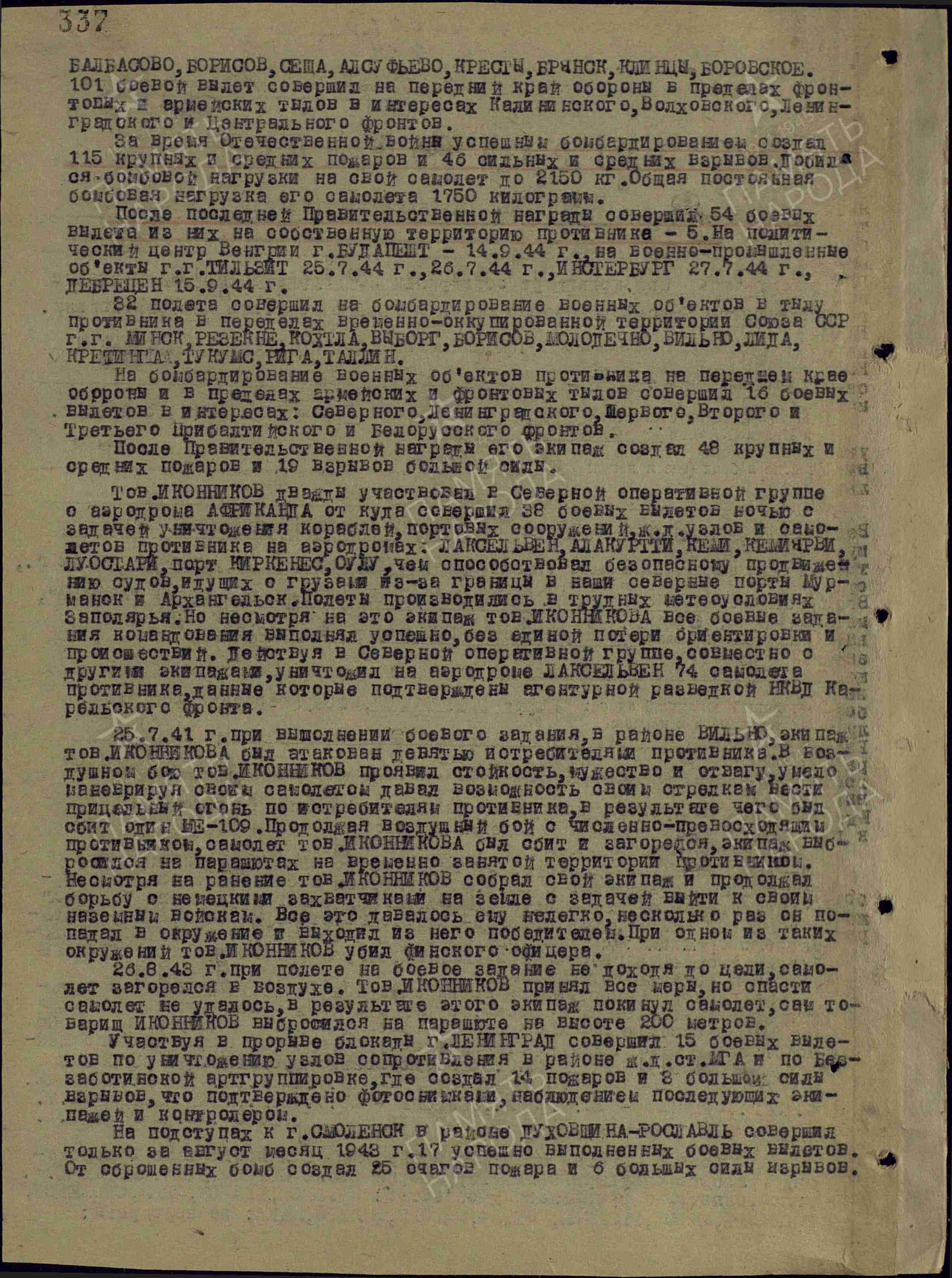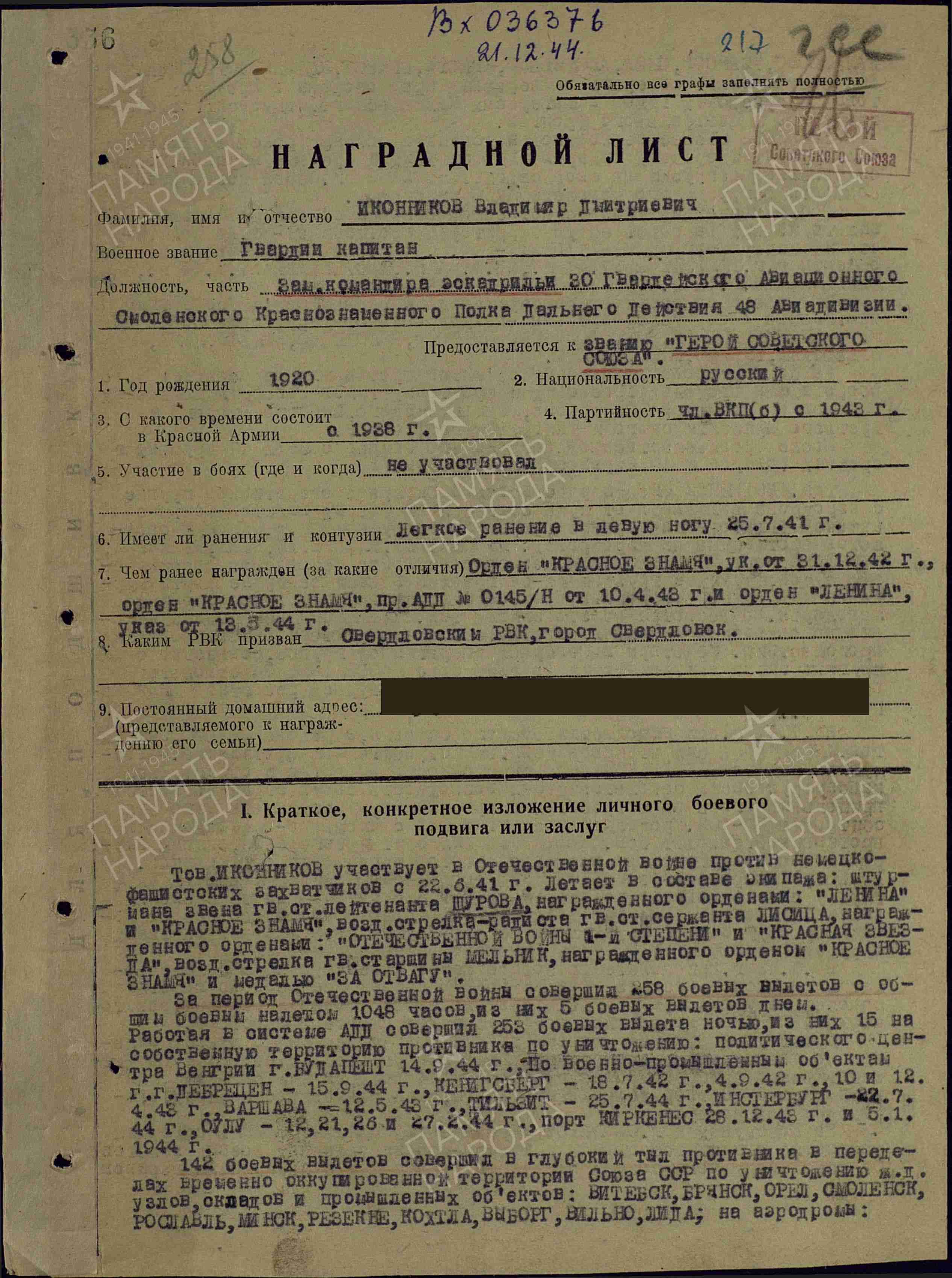 Заместитель командира эскадрильи 30-го гвардейского дальнебомбардировочного авиаполка гвардии капитан Иконников к октябрю 1944 года совершил 258 боевых вылетов, из них 253 – ночью, на бомбардировку военно-промышленных объектов в глубоком тылу противника. Бомбардировал военные объекты противника в городах: Кёнигсберг, Инстербург, Тильзит, Киркенес, Луостари, Дебрецен, Варшава, Оулу, Будапешт - на территории врага; а также: Ржев, Щигры, Брянск, Орёл, Сеща, Рославль, Смоленск, Витебск, Выборг, Борисов, Минск, Молодечно, Лида, Вильнюс, Рига, Тукумс, Таллинн, Алакуртти, – на временно оккупированной территории СССР. Уничтожил много боевой техники и живой силы противника.