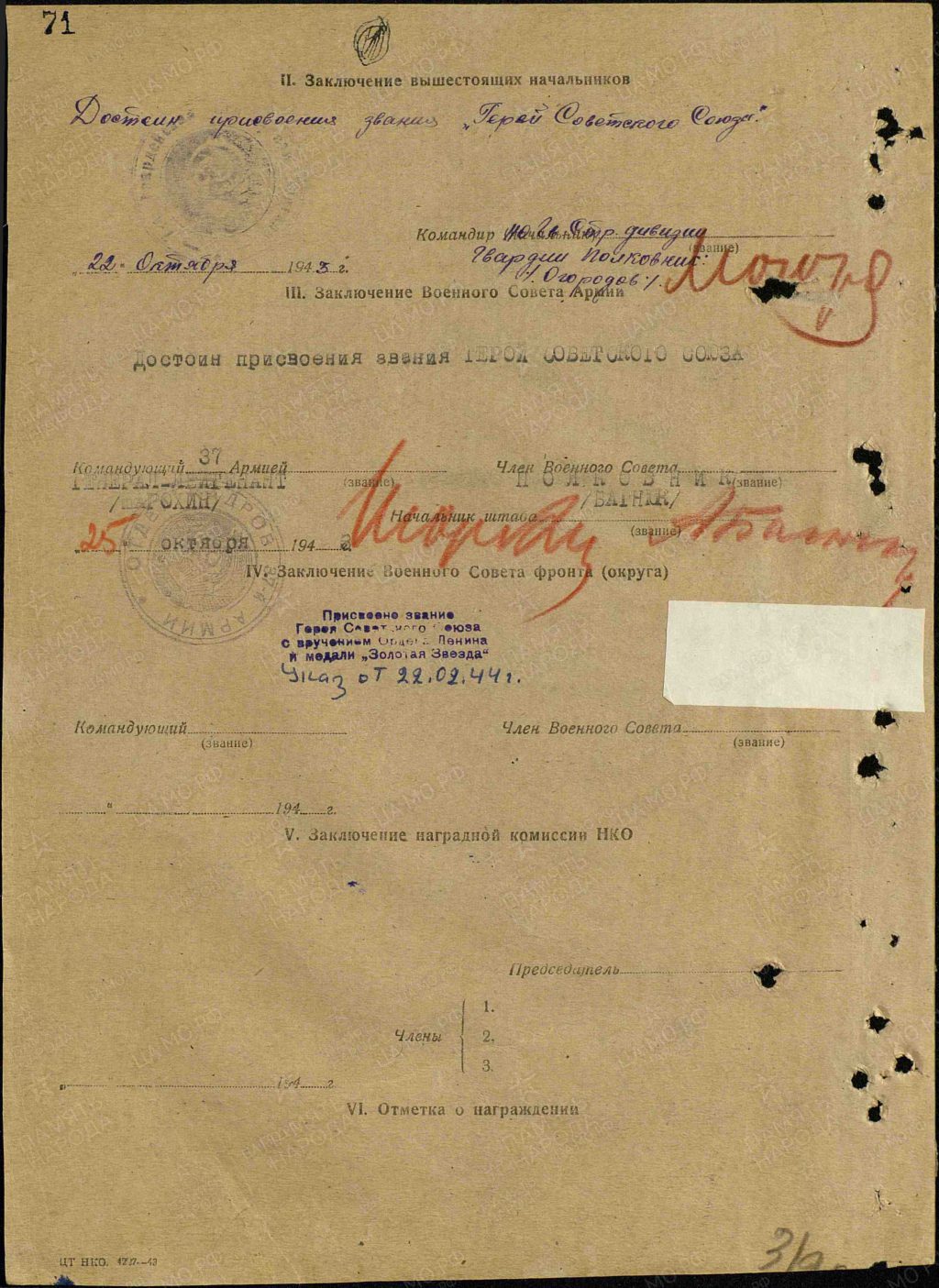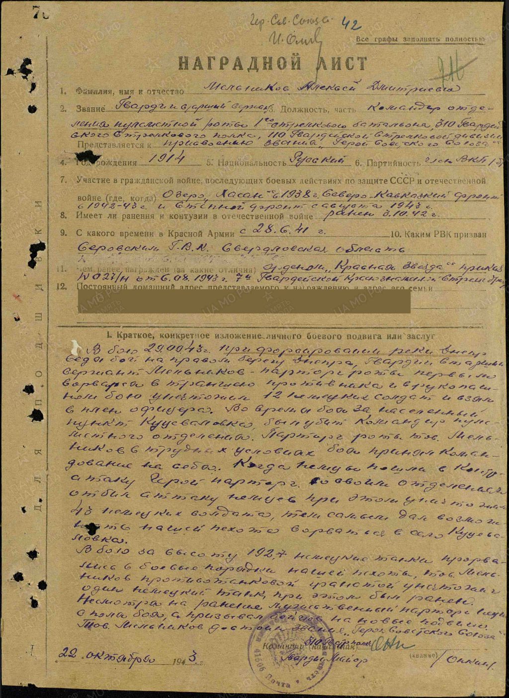 22 февраля 1944 года гвардии старшему сержанту А. Д. Мельникову присвоено звание Героя Советского Союза.