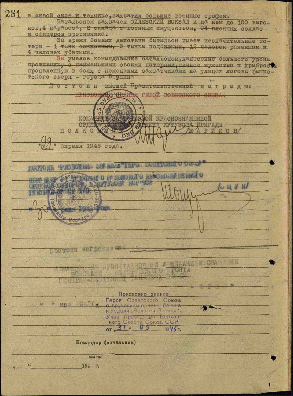 За умелое руководство батальоном, нанесение большого урона противнику с наименьшими потерями, личное мужество и храбрость, проявленные в боях с немецкими захватчиками на улицах города Берлин Анатолий Васильевич достоен высшей правительственной награды – звания “Героя Советского Союза”.