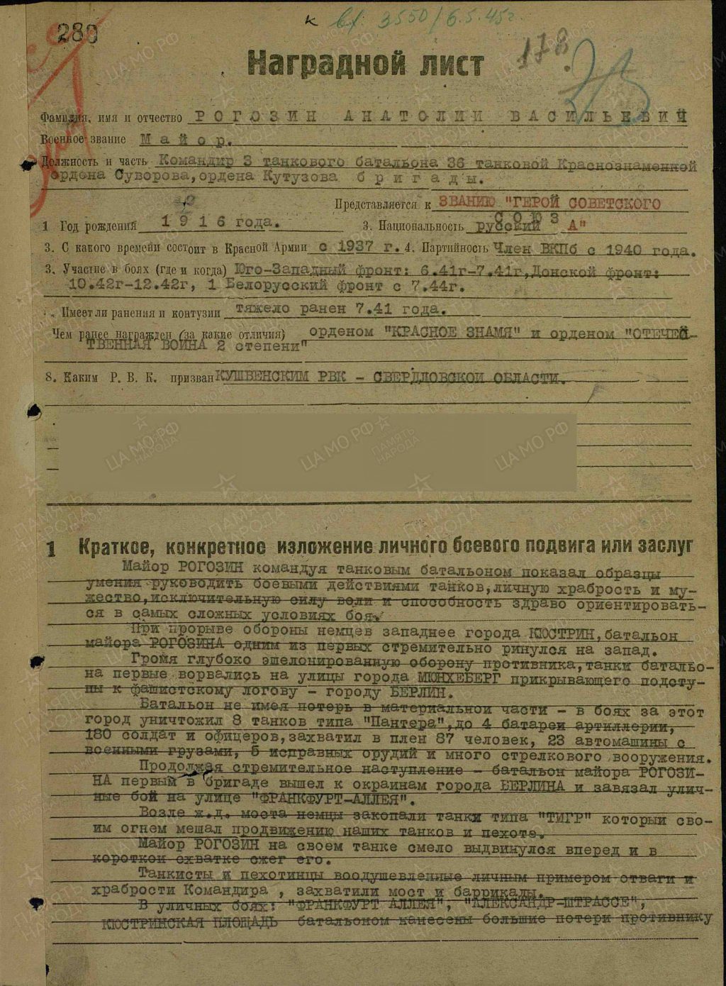 Особо отличился А. В. Рогозин в ходе Берлинской стратегической операции и при штурме Берлина.