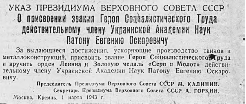 В 1934 году Евгений Патон создал в Киеве Институт электросварки АН УССР, директором которого оставался до конца жизни. Евгений Оскарович впервые в мире разработал комплексную программу развития сварочного производства.