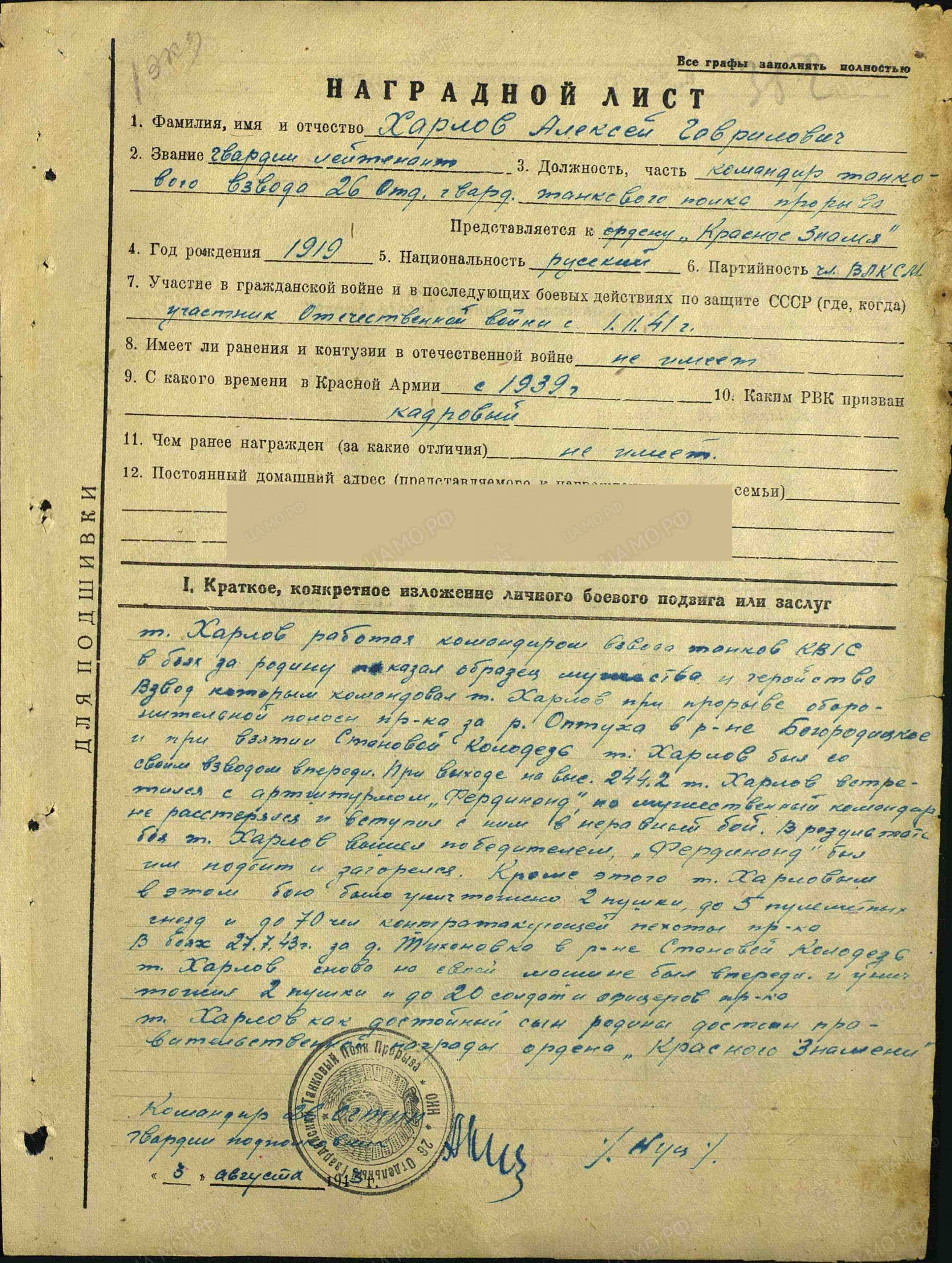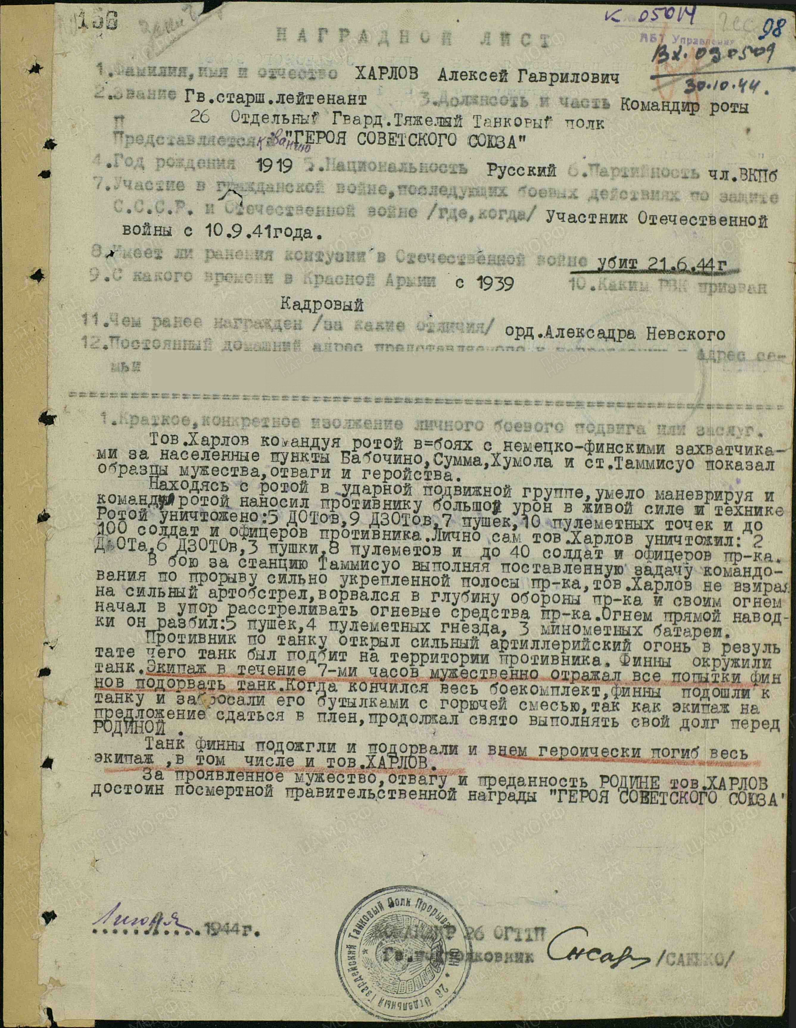 В 1944 году 26-й гвардейский тяжёлый танковый полк, подобно могучему тарану, должен был пробивать бреши в сильно укреплённой обороне противника. Остриём этого тарана стала рота Алексея Харлова. Называлась она в те дни ударной подвижной группой. Танкистам приходилось вступать в единоборство с одетыми в бетон огневыми точками, со спрятанными в засаду пушками и пулемётами. Только в боях за населённые пункты Бабочино, Сумма, Хумола рота Харлова блокировала и уничтожила пять дотов и девять дзотов, разбила семь пушек и десять пулемётов. Их них восемь пулемётов, три пушки и несколько укреплённых огневых точек уничтожил сам командир, показывая пример экипажу, а не просто ведя роту.