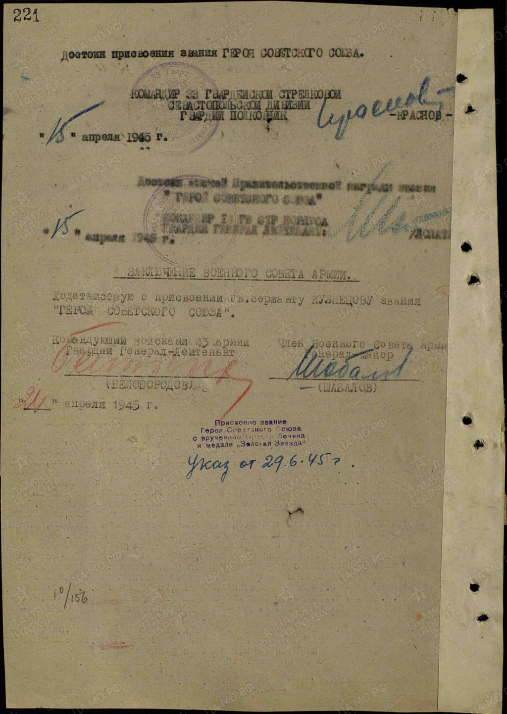Указом Президиума Верховного Совета СССР от 29 июня 1945 года гвардии сержант Анатолий Кузнецов был удостоен высокого звания Героя Советского Союза с вручением ордена Ленина и медали «Золотая Звезда».