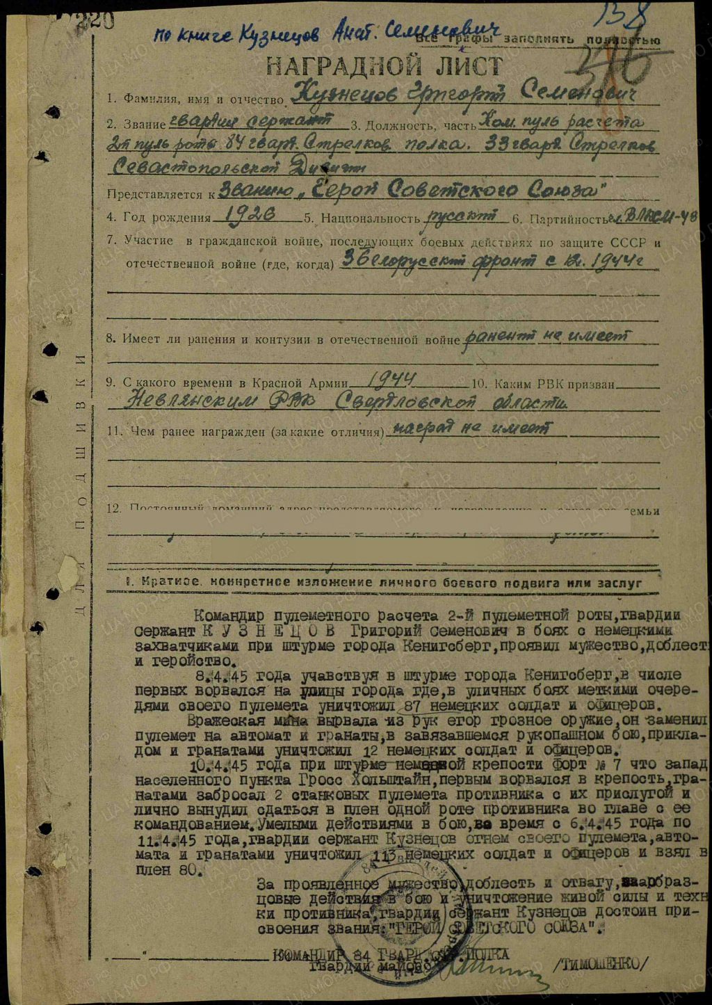 К апрелю 1945 года гвардии сержант Анатолий Кузнецов командовал пулемётным расчётом 84-го гвардейского стрелкового полка 33-й гвардейской стрелковой дивизии 43-й армии 3-го Белорусского фронта. Отличился во время штурма Кёнигсберга.