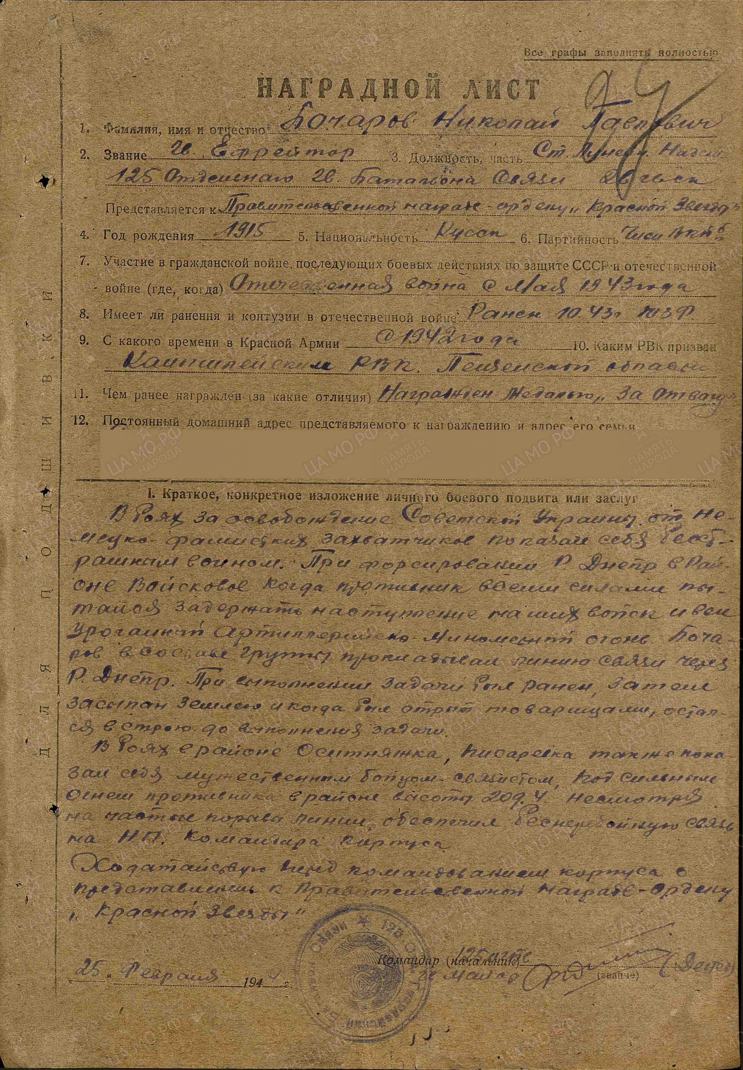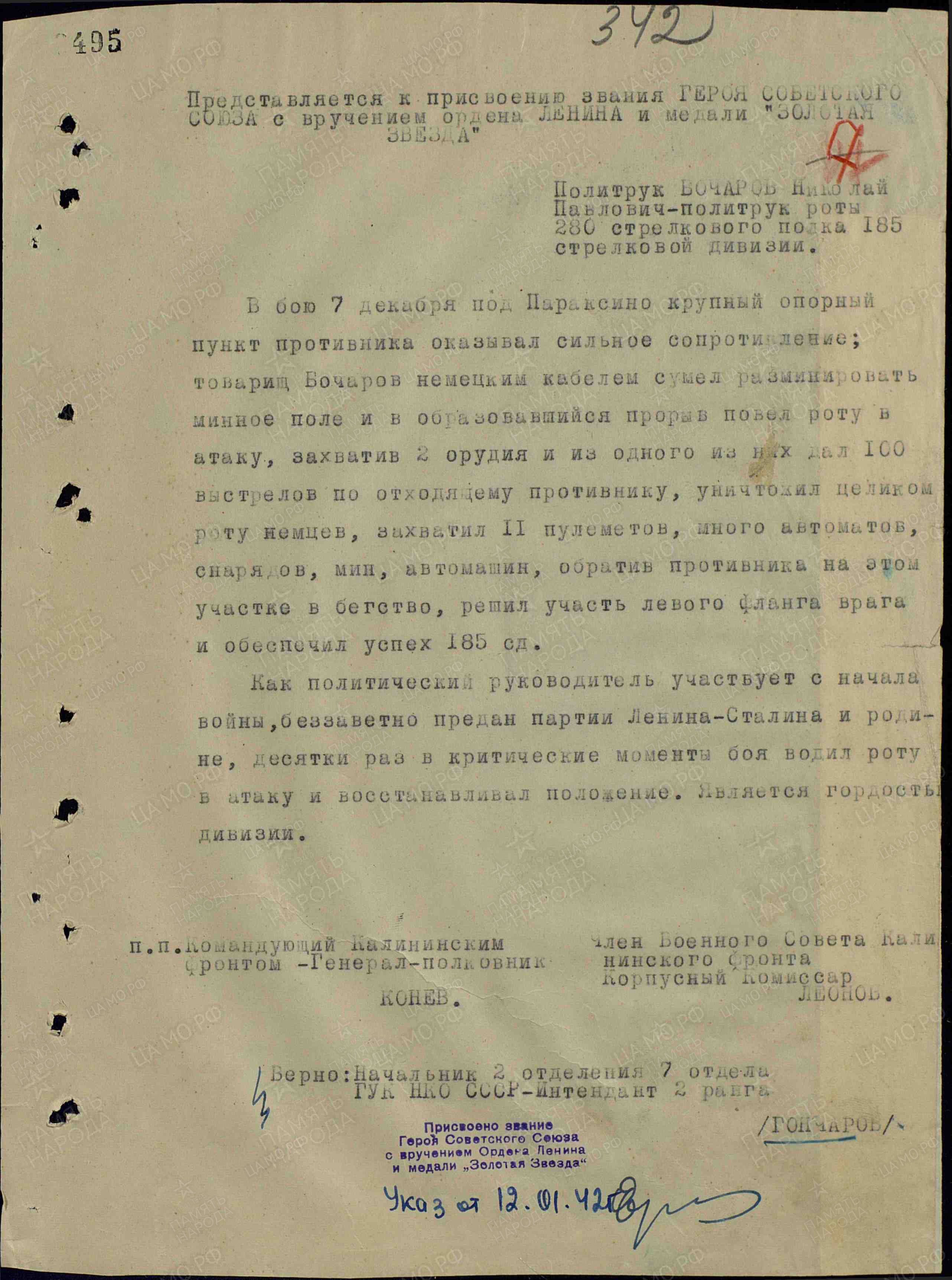 Бочаров Николай Павлович - политрук роты 280-го стрелкового полка 185-й стрелковой дивизии 30-й армии Западного фронта.