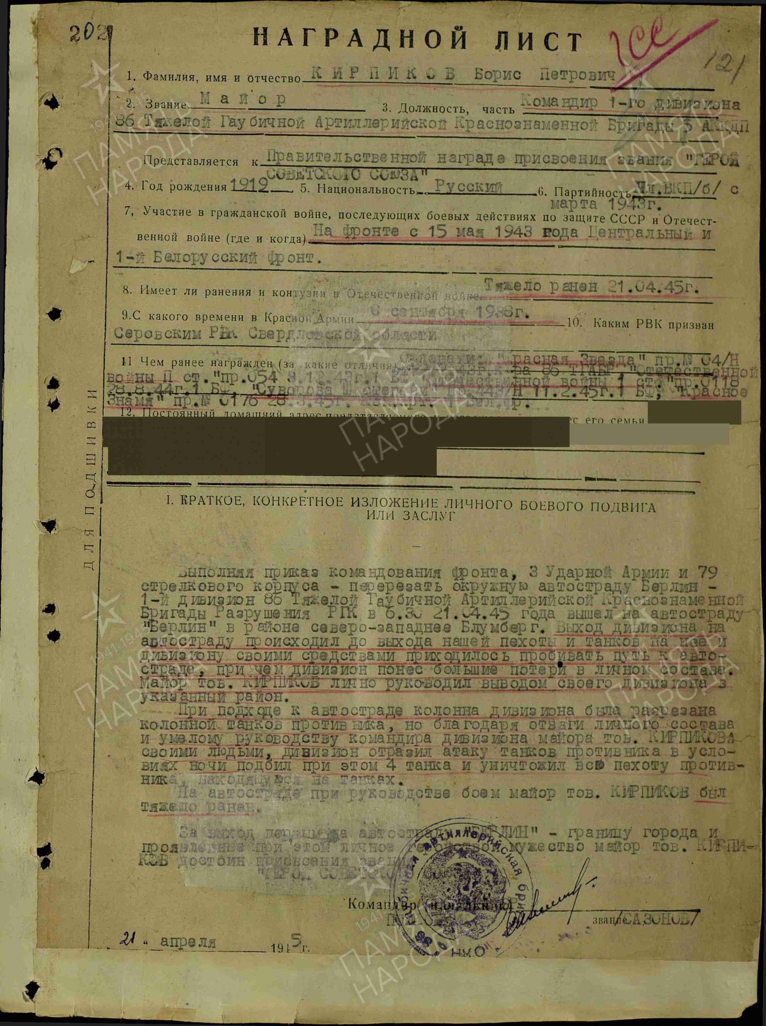 Дивизион 86-й тяжёлой гаубичной артиллерийской бригады разрушения (5-я артиллерийская дивизия, 4-й артиллерийский корпус прорыва, 3-я ударная армия, 1-й Белорусский фронт) под командованием майора Бориса Кирпикова 21 апреля 1945 года в числе первых прорвался к автостраде у населенного пункта Блумберг (15 километров северо-восточнее Берлина).