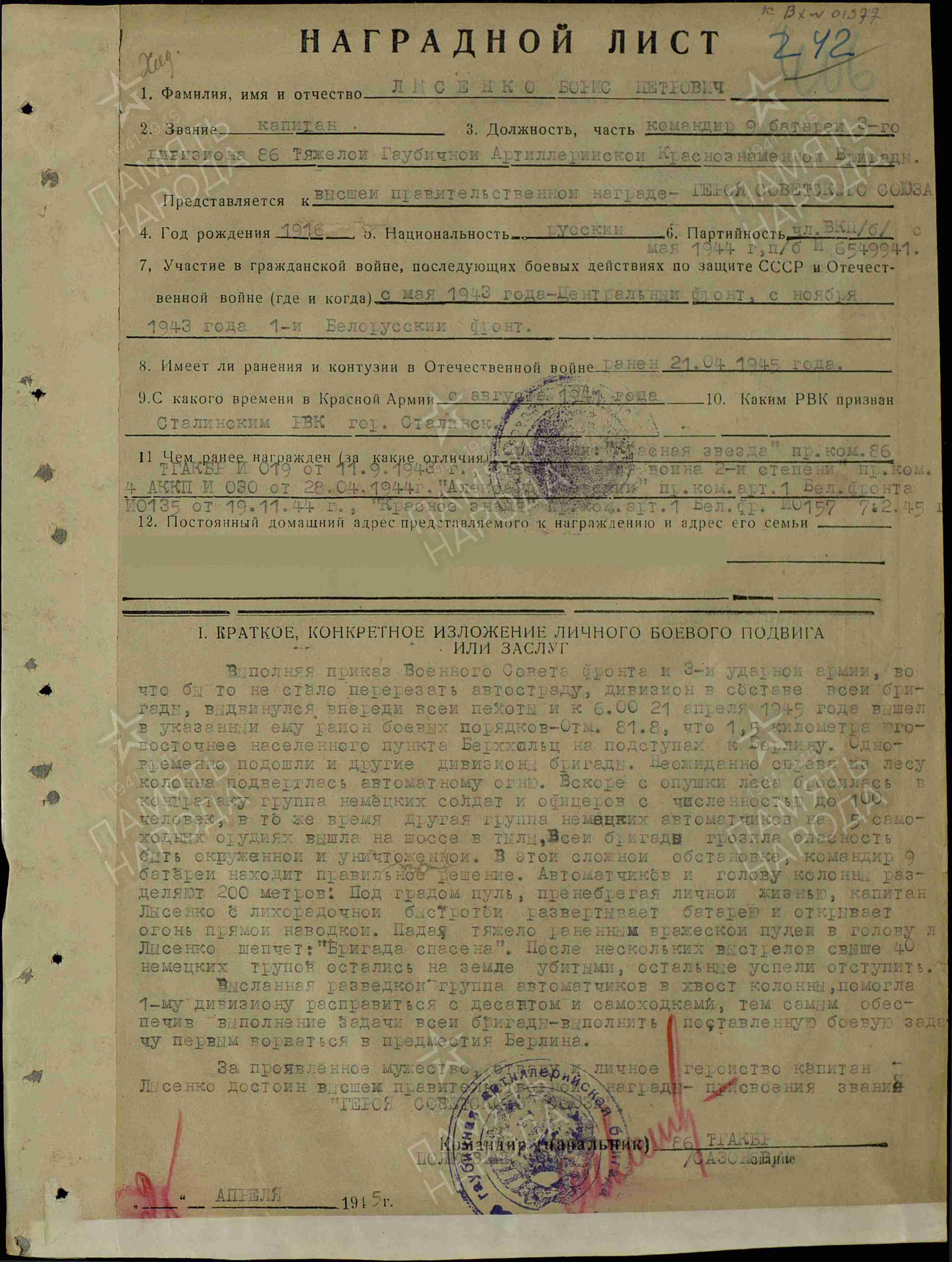 На рассвете 21 апреля 1945 года бригада, в которой служил комбат Б.П. Лысенко, должна была перерезать кольцевую автостраду и выйти на окраину Берлина. Прорвав оборону фашистов, колонна устремилась к дороге, но тут с тыла появился противник. Бригаде грозило окружение. Капитан Лысенко приказал развернуть орудие и открыть огонь прямой наводкой. Атака была отбита, было уничтожено более 40 фашистов.