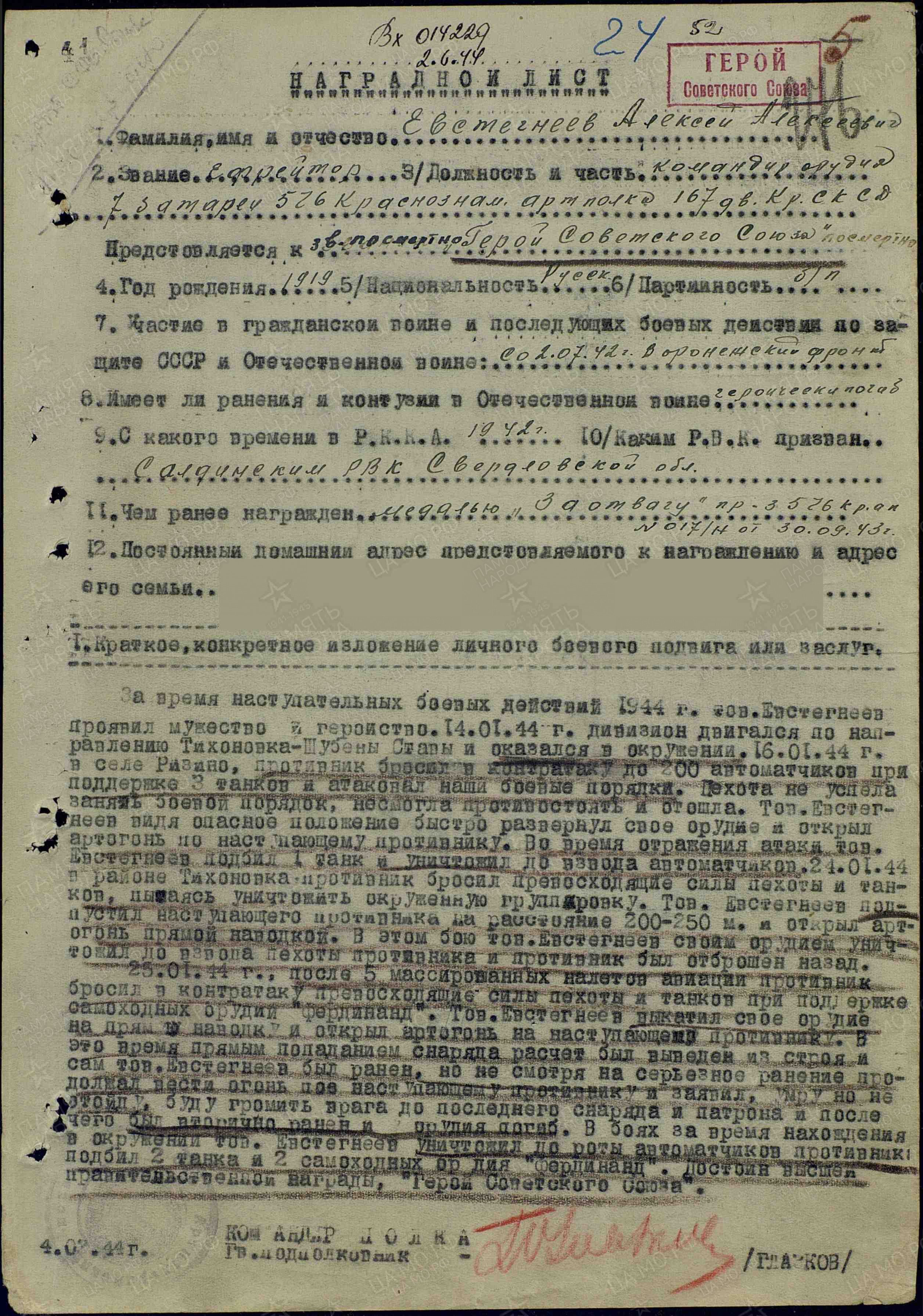 Евстигнеев Алексей Алексеевич - командир орудия 576-го артиллерийского полка (167-я стрелковая дивизия, 40-я армия, 1-й Украинский фронт), ефрейтор.