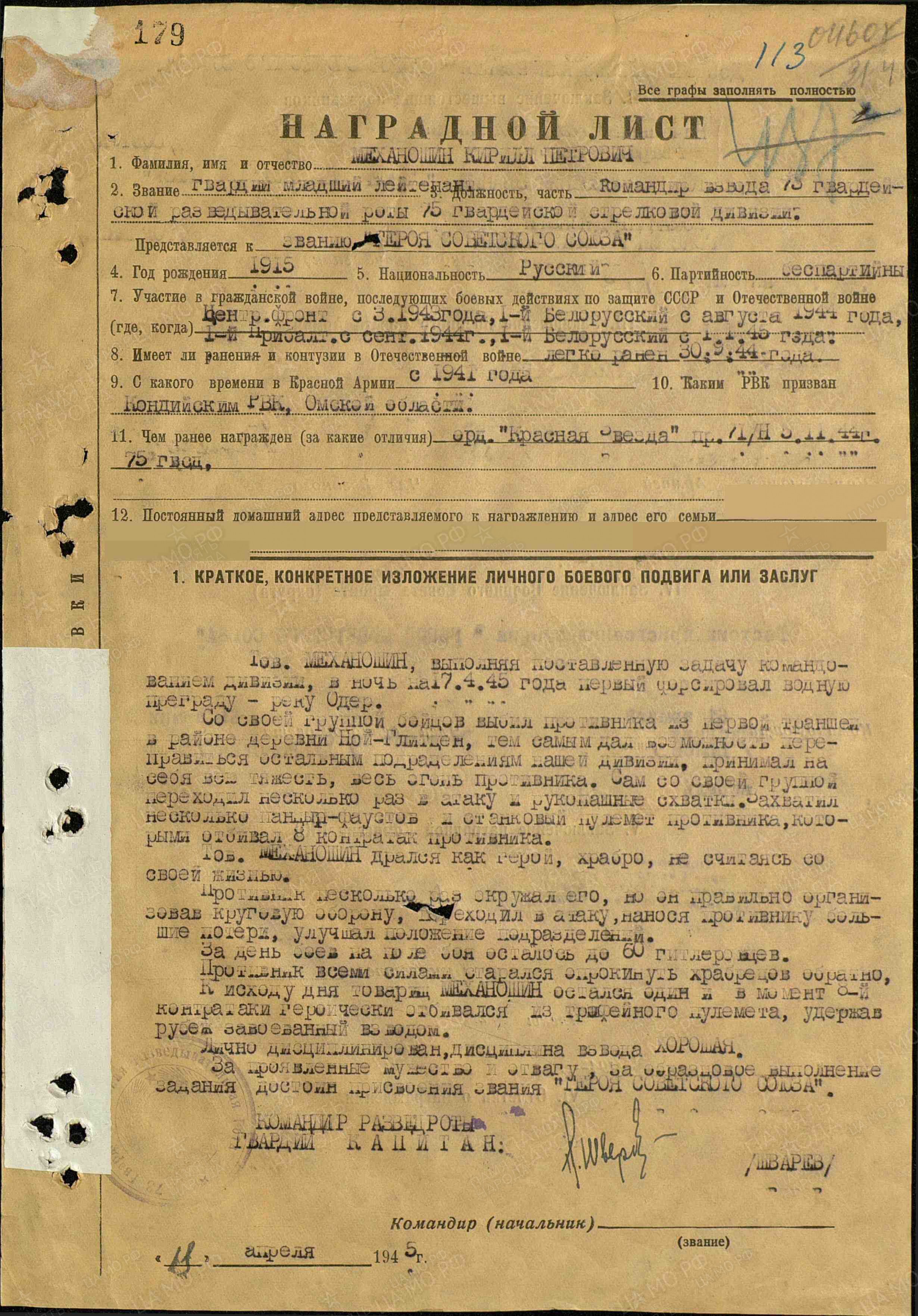 31 мая 1945 года Указом Президиума Верховного Совета СССР командиру К.П. Механошину присвоено звание Героя Советского Союза.