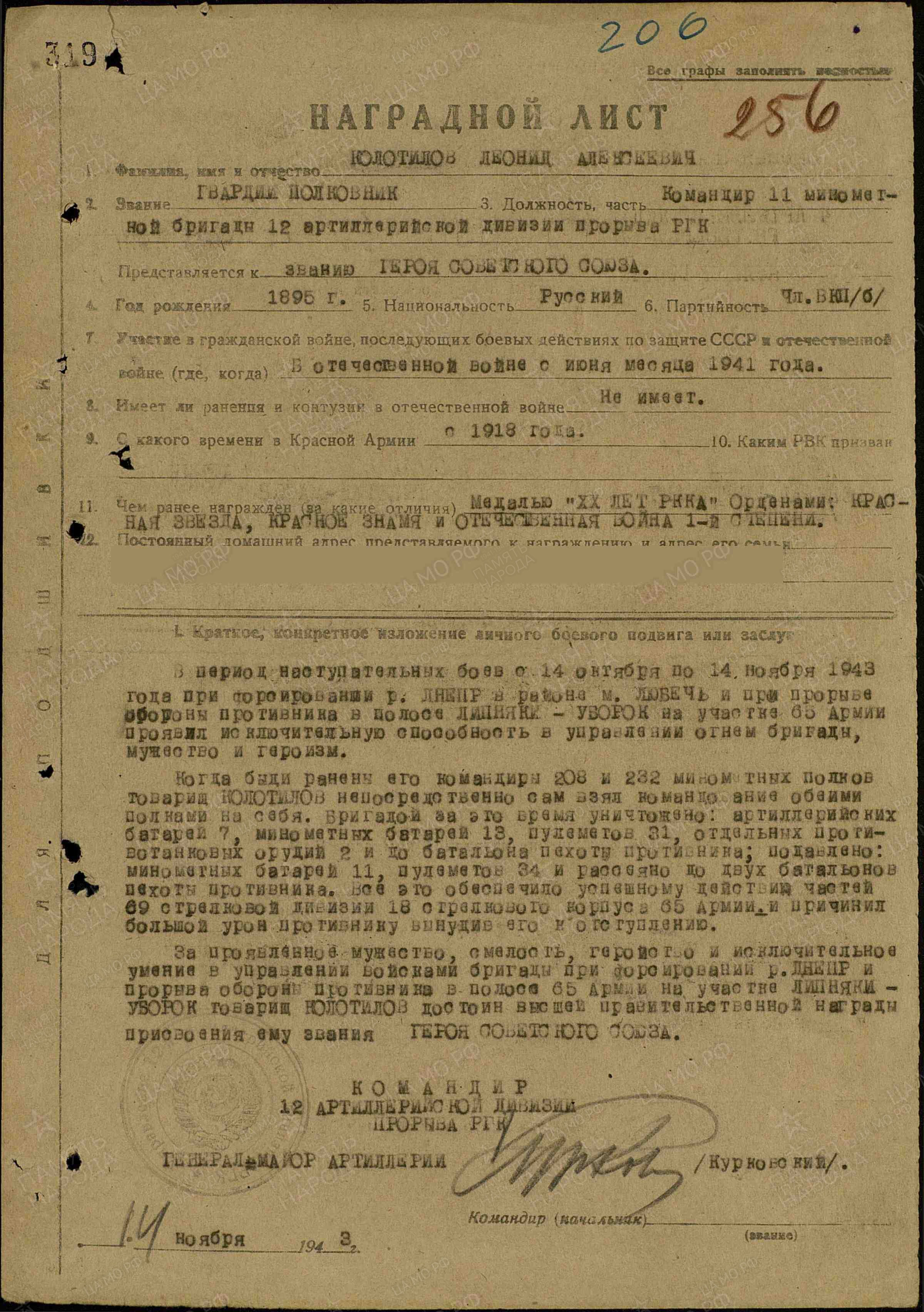 Командир 11-й миномётной бригады 12-й артиллерийской дивизии 4-го артиллерийского корпуса прорыва 61-й армии Центрального фронта, полковник Леонид Колотилов отличился в битве за Днепр. 14 октября 1943 года на подручных средствах переправил бригаду в районе села Любеч Репкинского района Черниговской области. В боях по удержанию плацдарма на правом берегу Днепра бригада уничтожила до 20 артиллерийских и миномётных батарей, 34 пулемёта и много живой силы противника, чем обеспечила переправу частей стрелкового корпуса.
