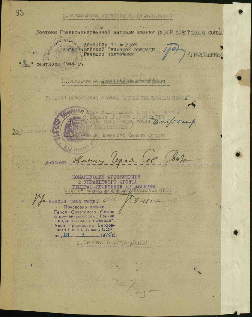 в Березнеговато-Снегирёвской и Одесской операциях, в Свирско-Петрозаводской операции, в том числе в освобождении городов Олонец, Питкяранта, в Ясско-Кишинёвской операции и ликвидации Кишинёвской вражеской группировки, в Дебреценской и Будапештской операциях с форсированием рек Тиса и Дунай на территории Югославии и Венгрии и освобождением города Секешфехервар – в 1944 году;
