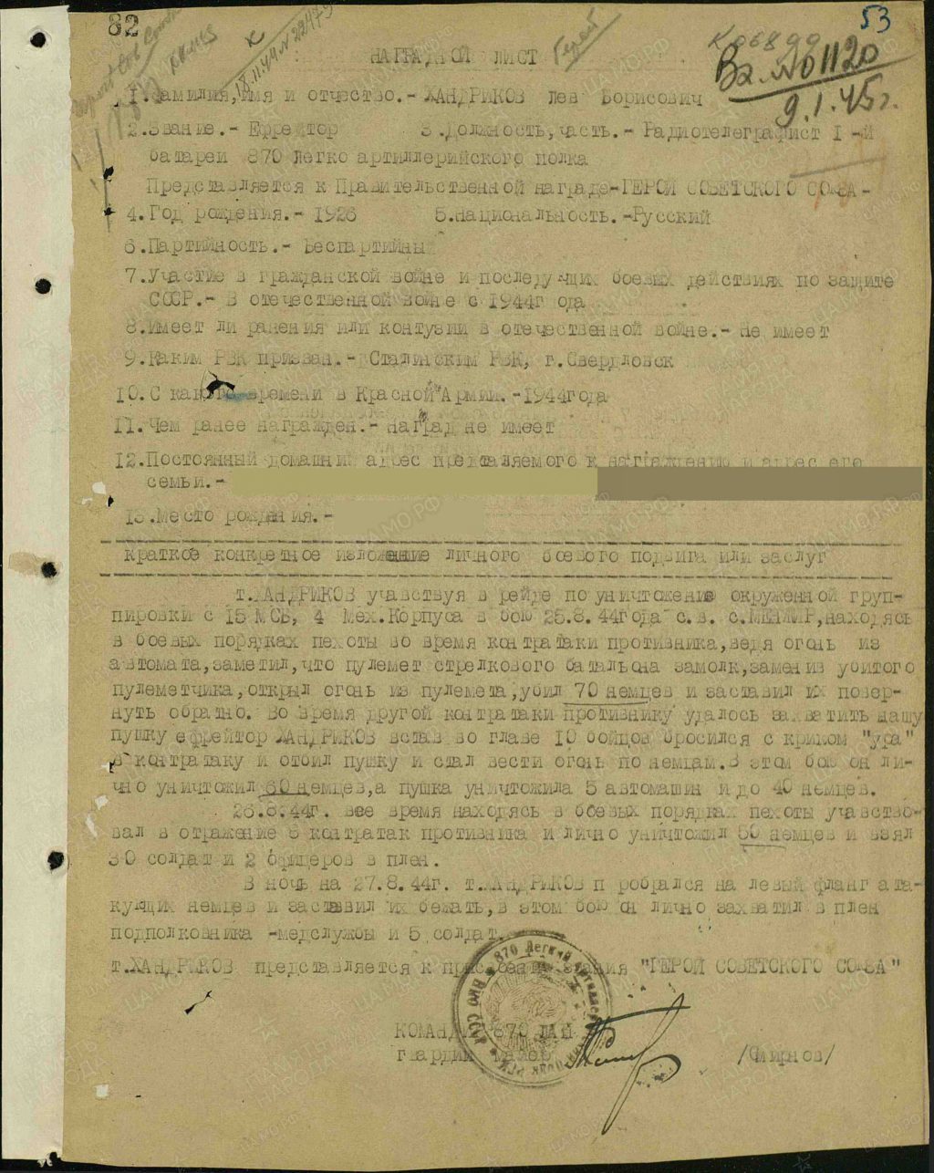Хандриков Лев Борисович – радиотелеграфист батареи 870-го лёгкого артиллерийского полка 11-й лёгкой артиллерийской бригады 7-й артиллерийской Запорожской дивизии прорыва 3-го Украинского фронта, ефрейтор.