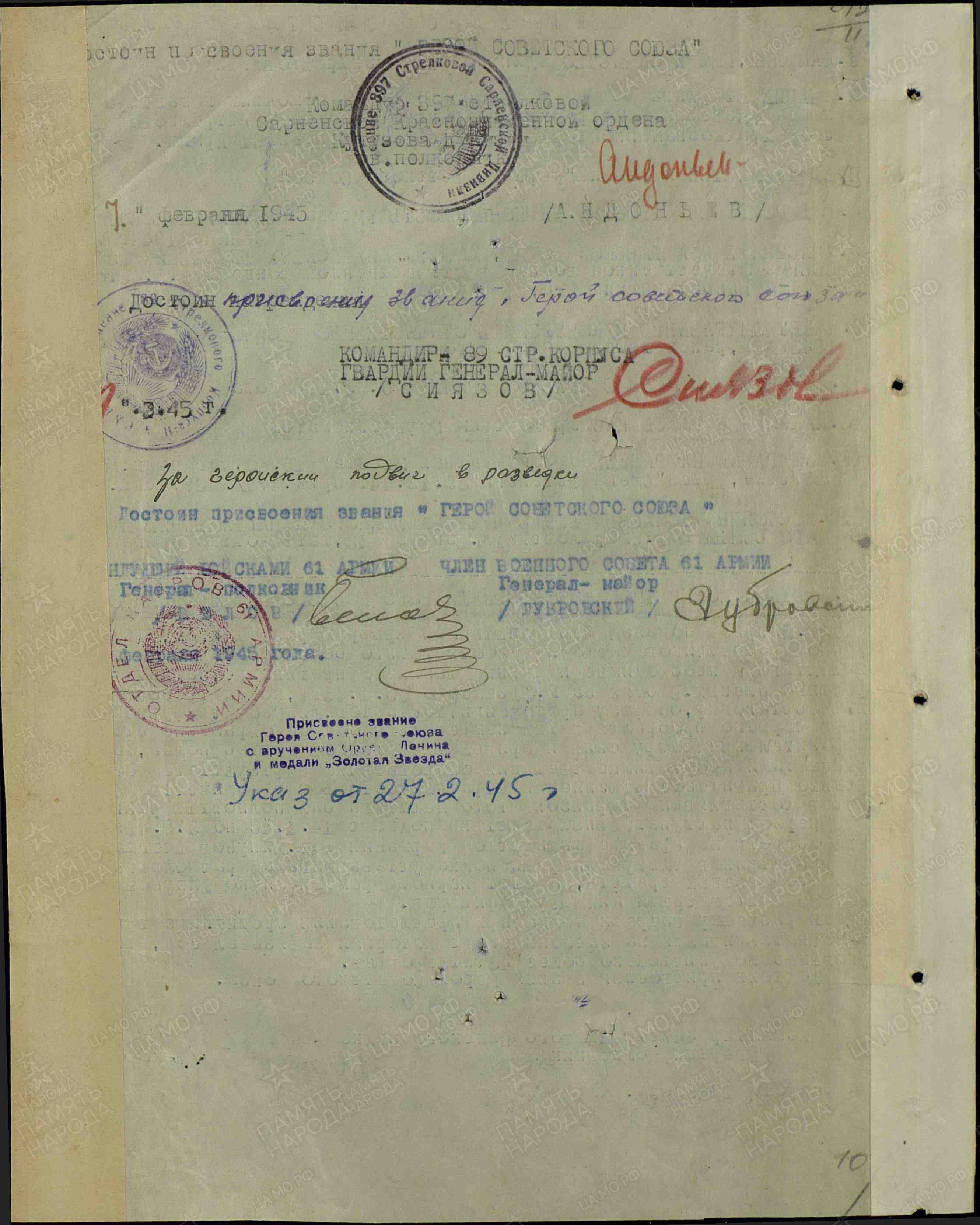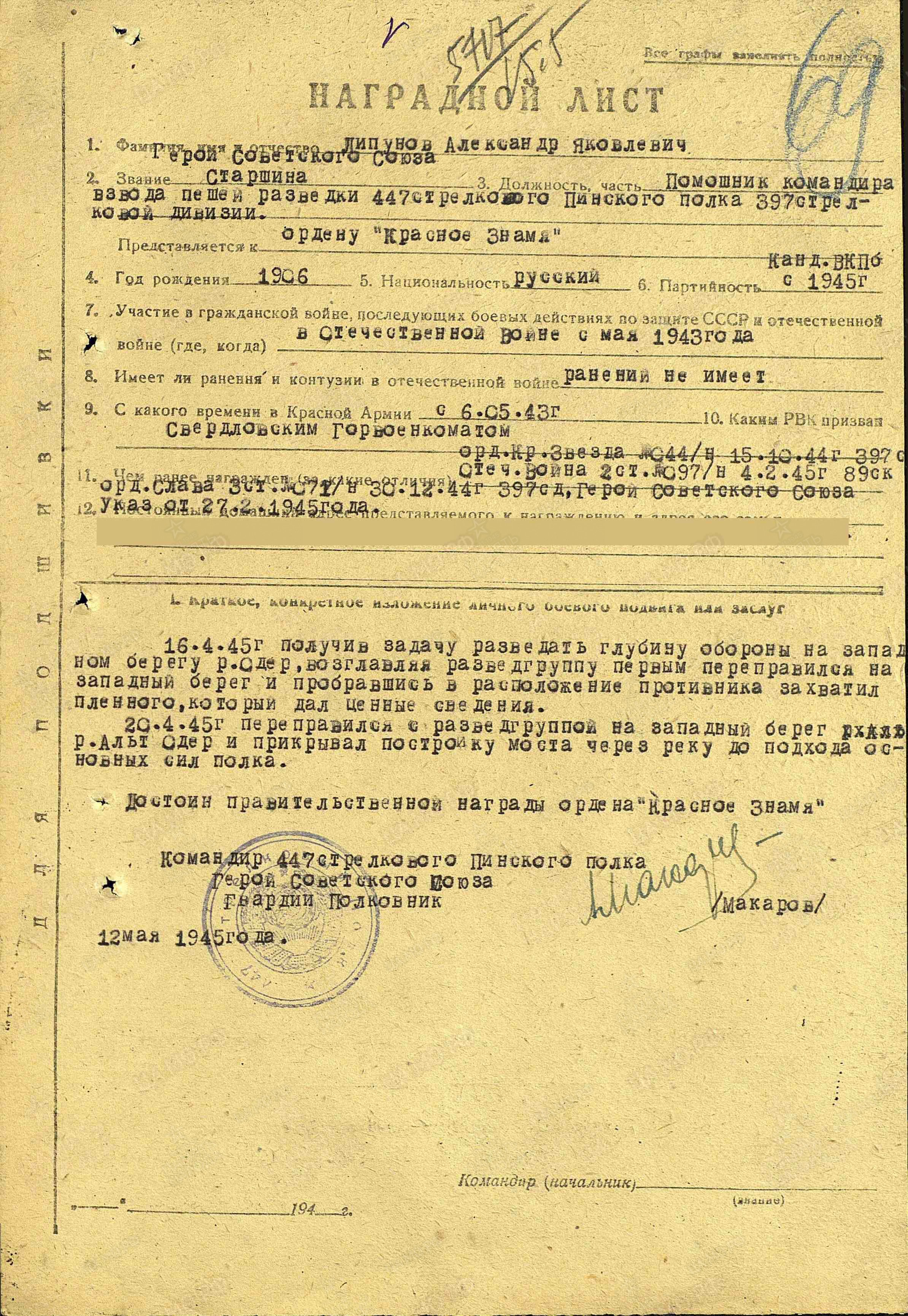 Липунов Александр Яковлевич – помощник командира взвода разведки 447-го стрелкового Пинского полка 397-й стрелковой Сарненской Краснознамённой ордена Кутузова дивизии 61-й армии 1-го Белорусского фронта, старшина.