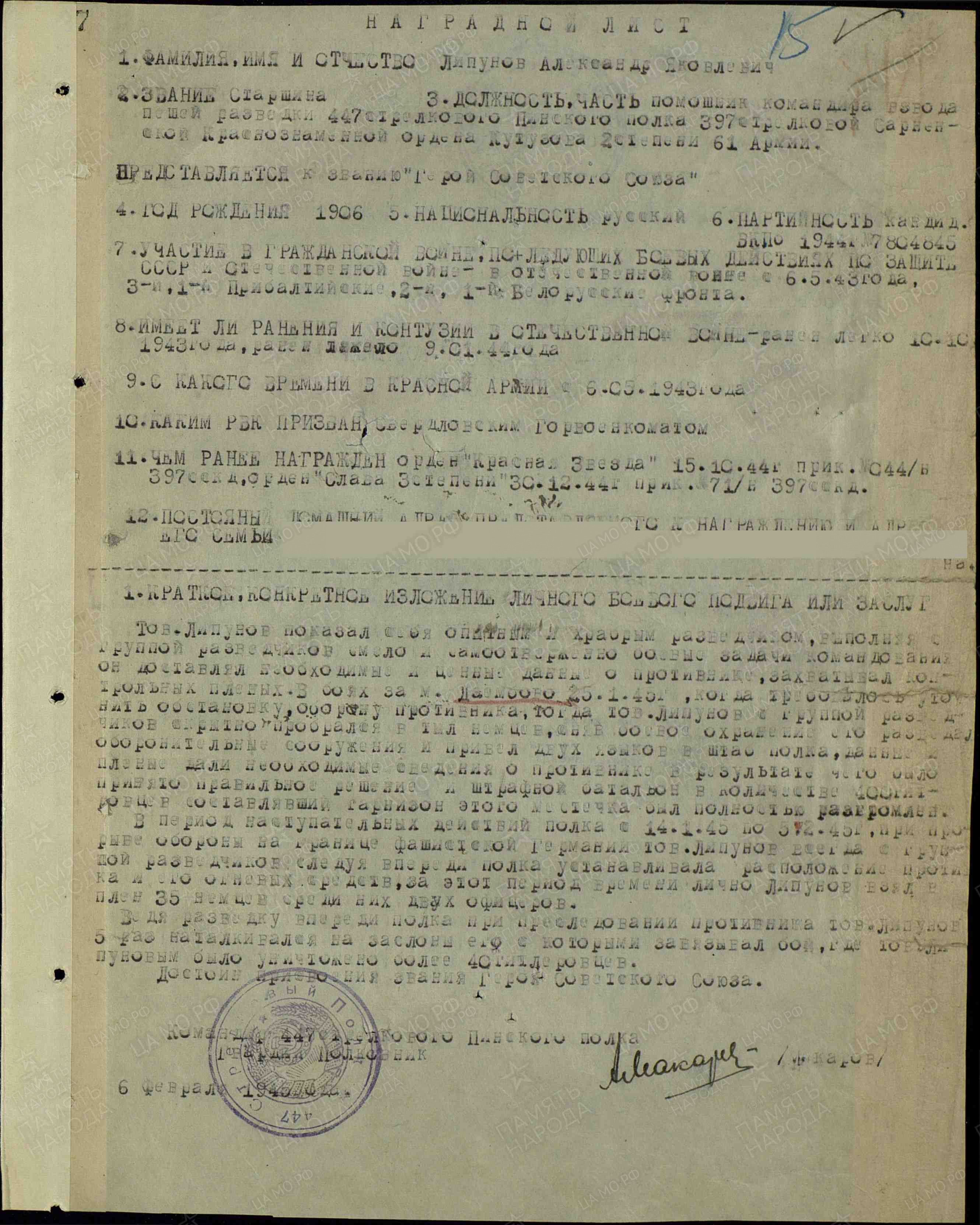 Помощник командира взвода разведки 447-го стрелкового Пинского полка (397-я стрелковая дивизия, 61-я армия, 1-й Белорусский фронт) старшина Александр Липунов особо отличился в боях при освобождении Польши.