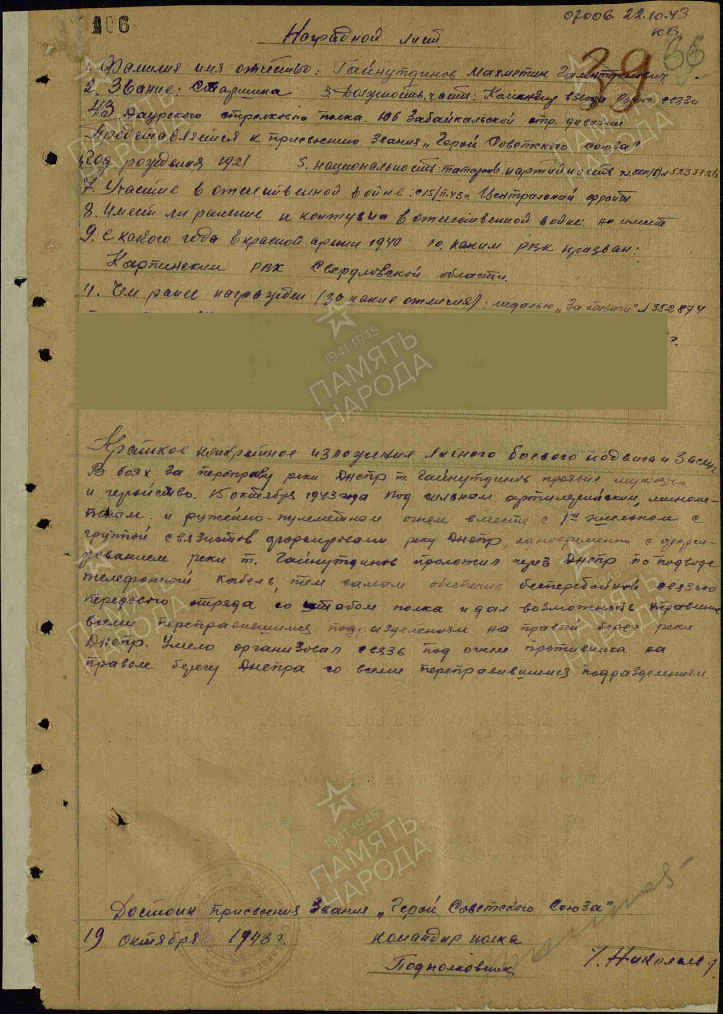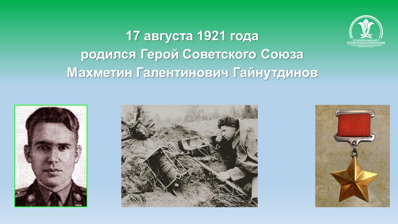Гайнутдинов Махметин (с 1969 года - Дмитрий) Галентинович – командир взвода роты связи 43-го стрелкового полка 106-й стрелковой дивизии 65-й армии Центрального фронта, старшина.