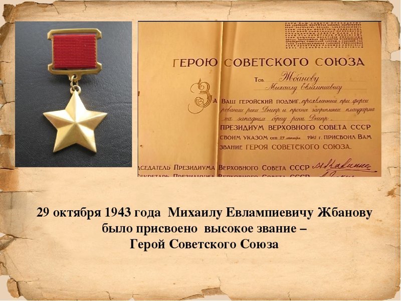 Указом Президиума Верховного Совета СССР от 29 октября 1943 года за успешное форсирование реки Днепр, прочное закрепление и расширение плацдарма на Западном берегу реки Днепр и проявленные при этом отвагу и геройство сержант Жбанов Михаил Евлампиевич удостоен звания Героя Советского Союза с вручением ордена Ленина и медали «Золотая Звезда» (№ 3576).