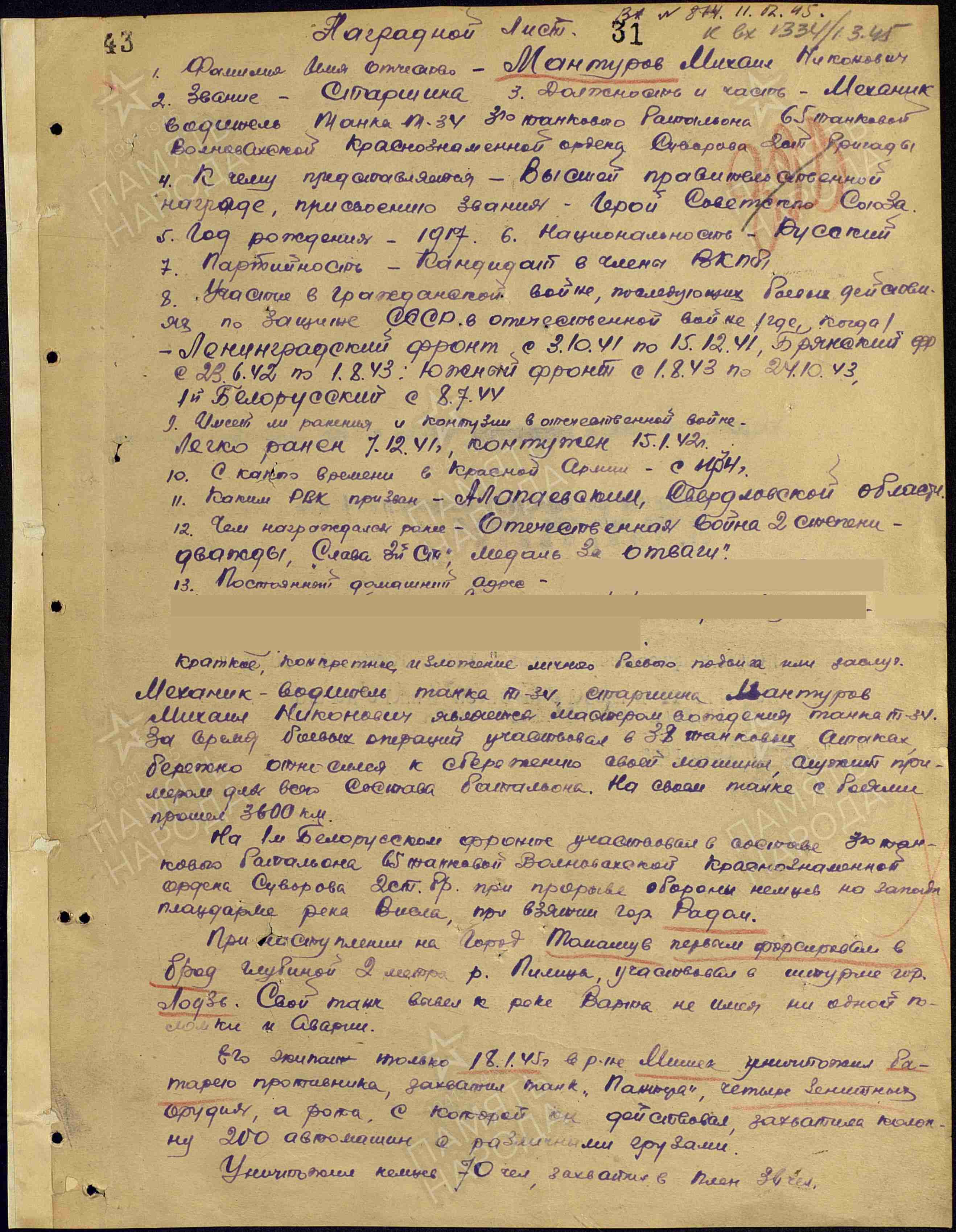 Из наградного листа: «Механик-водитель танка Т-34 старшина Мантуров М.Н. является мастером вождения танка Т-34. За время боевых операций участвовал в 38 танковых атаках, бережно относился к своей машине. Служил примером для всего состава батальона. На своем танке прошел с боями 3600 километров. Экипаж Мантурова только 18 января 1945 года в районе Мишек (Польша) уничтожил батарею противника, захватил танк «Пантера», четыре зенитных орудия, а рота, с которой он действовал, захватила колонну из 200 автомашин с различными грузами. Было уничтожено 70 фашистов, 36 - захвачено в плен».