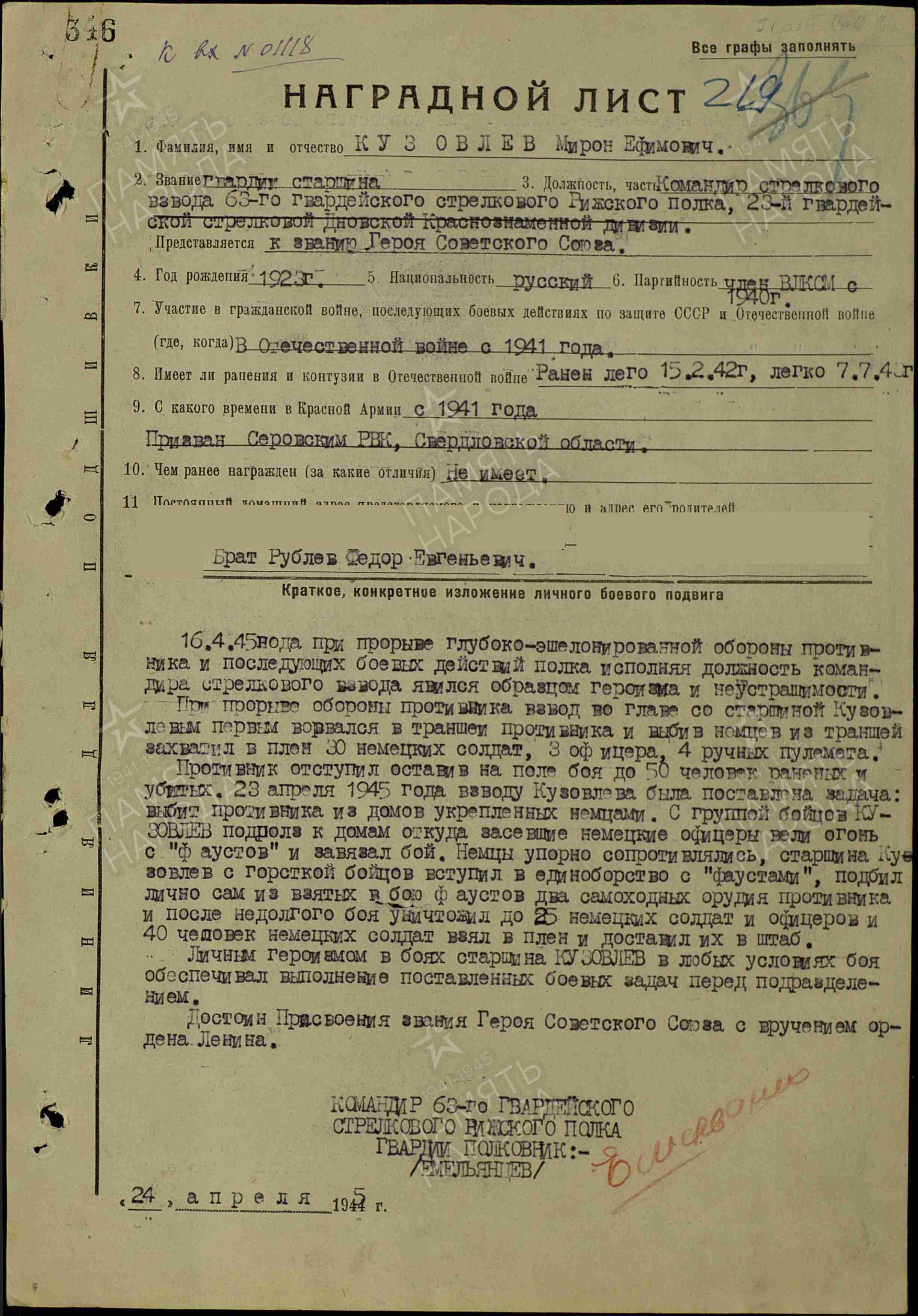 Ранним утром 16 апреля 1945 года артиллерийская канонада на Одере возвестила о начале заключительного этапа войны. При свете прожекторов, включенных на полную мощность во всей полосе наступления, старшина Кузовлев повел свой взвод, в атаку. Первое время противник, подавленный огнем артиллерии и внезапностью ночной атаки, организованного сопротивления не оказал. Взвод Кузовлева первым ворвался во вражеские траншеи и захватил в плен 30 немецких солдат и 3 офицеров, оглушенных взрывами снарядов. От огня нашей артиллерии оборонявшаяся здесь 309я пехотная дивизия противника потеряла до 60 процентов своего состава. К семи часам утра наши части овладели передним краем противника, а к вечеру гвардейцы 23й дивизии завершили прорыв всей главной полосы обороны. 21 апреля советские воины ворвались на северную окраину Берлина.