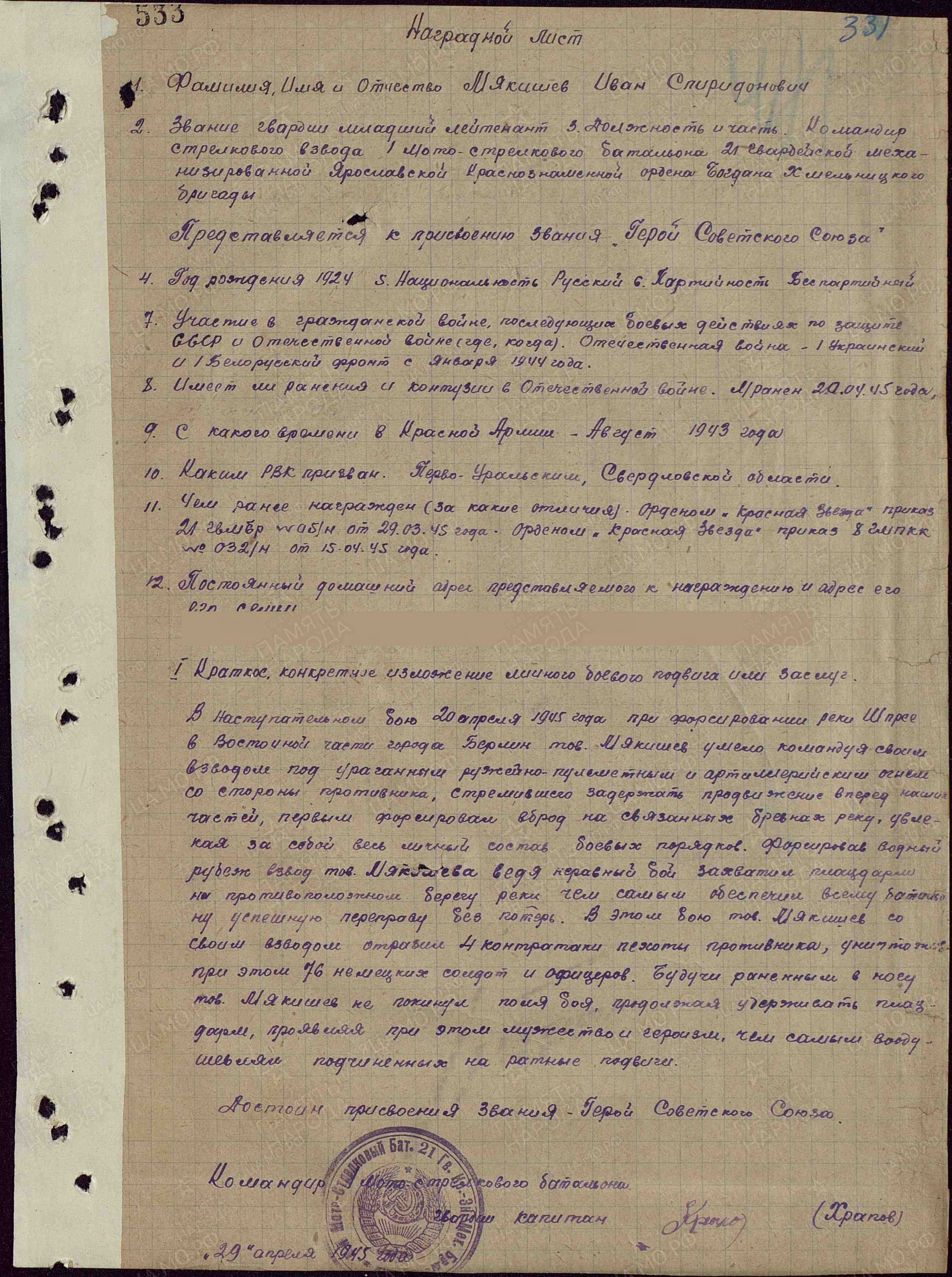 Мякишев Иван Спиридонович - командир взвода 21-й гвардейской механизированной Ярославской Краснознаменной ордена Богдана Хмельницкого бригады (8-й гвардейский механизированный корпус, 1-я гвардейская танковая армия, 1-й Белорусский фронт), гвардии младший лейтенант.