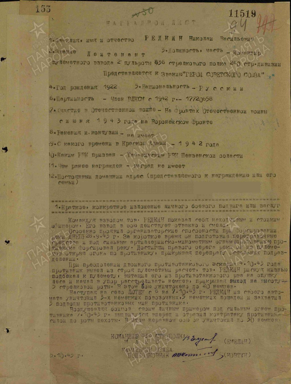 28 сентября 1943 года лейтенант Н.В. Редкин с бойцами взвода под сильным огнем противника в числе первых переправился через реку Днепр в районе села Лютеж (Вышгородский район Киевской области).