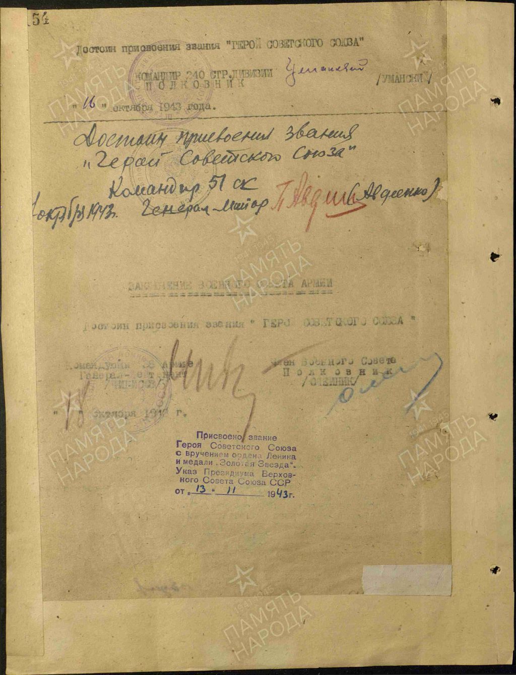 Особо отличился в боях при форсировании Днепра и удержании плацдарма на правом берегу.