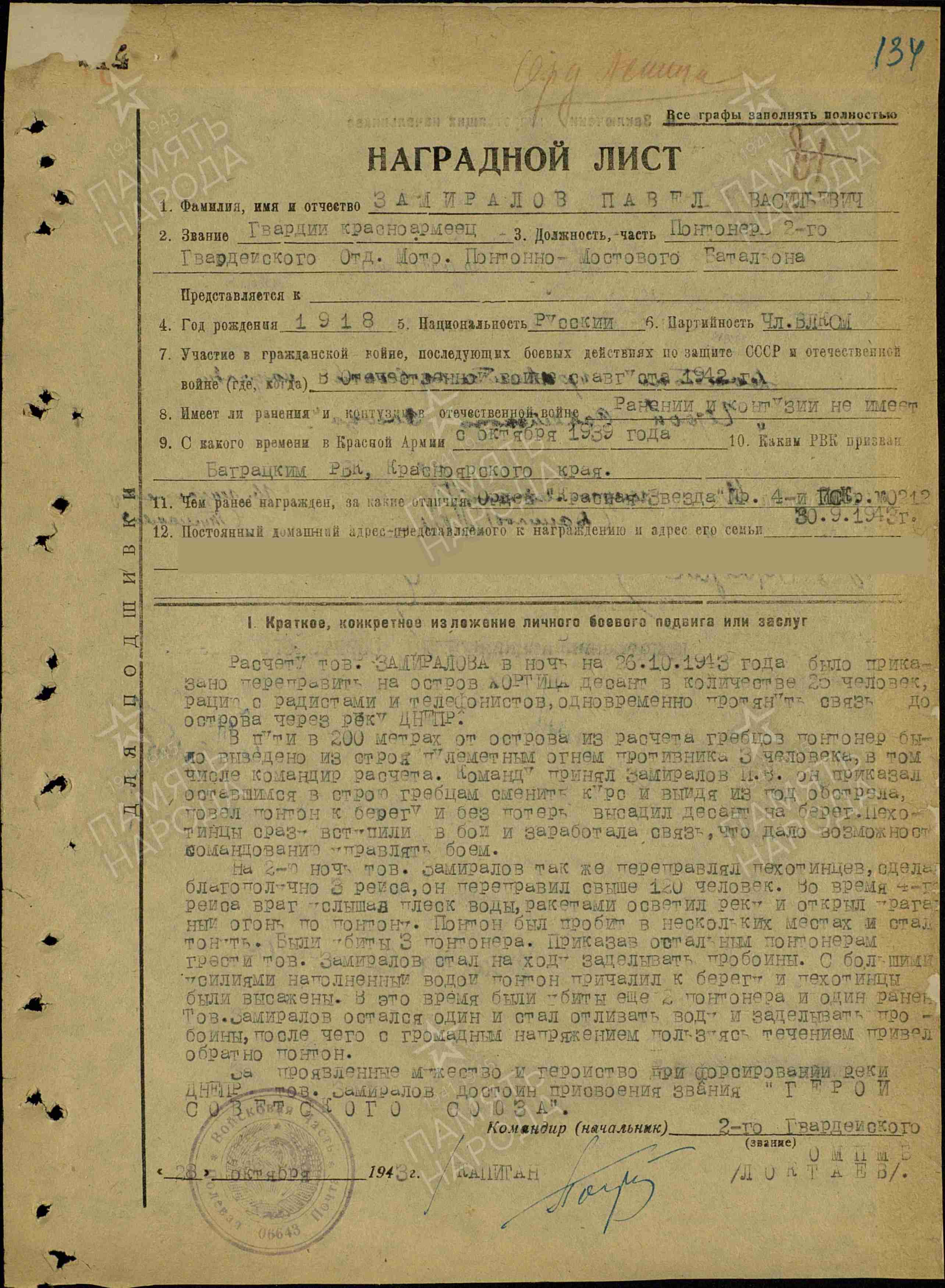 За мужество и героизм, проявленные при форсировании Днепра, Указом Президиума Верховного Совета СССР от 22 февраля 1944 года командиру отделения понтонеров 2-го Гвардейского отдельного моторизированного понтонно-мостового батальона (4-я понтонно-мостовая бригада, 8-я Гвардейская армия, 3-й Украинский фронт) гвардии сержанту Павлу Васильевичу Замиралову было присвоено звание Героя Советского Союза.