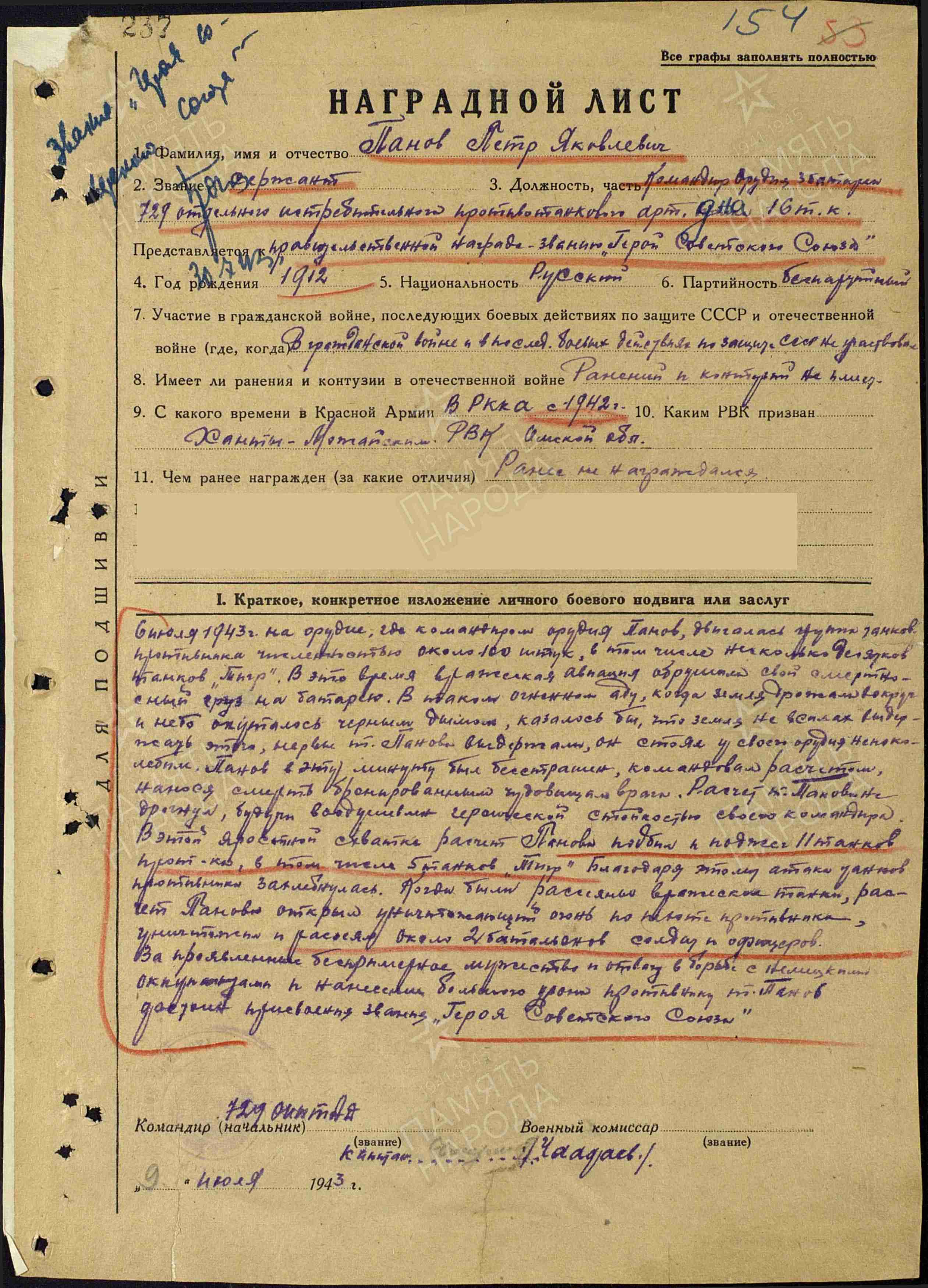 В этой яростной схватке расчет сержанта Петра Панова подбил и поджег в общем итоге одиннадцать танков противника, в том числе пять тяжелых - «тигров». Благодаря мужеству и стойкости артиллеристов танковая атака гитлеровцев захлебнулась. И тогда расчет Панова открыл губительный огонь по пехоте, уничтожив и рассеяв еще около двух батальонов гитлеровских солдат и офицеров, сохранив при этом свой состав полностью.