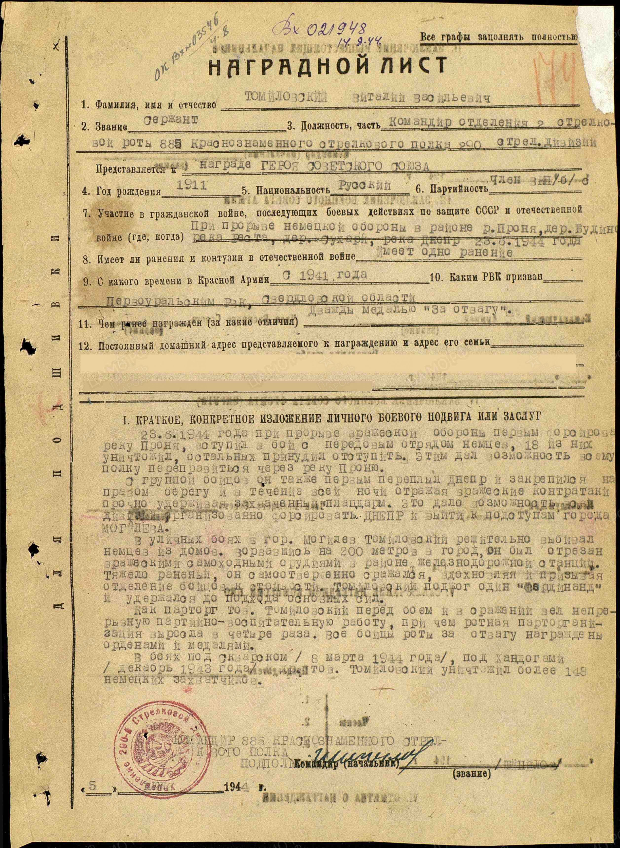 Томиловских Виталий Васильевич – командир отделения 885-го стрелкового Краснознаменного полка (290-я стрелковая дивизия, 50-я армия, 2-й Белорусский фронт), сержант.