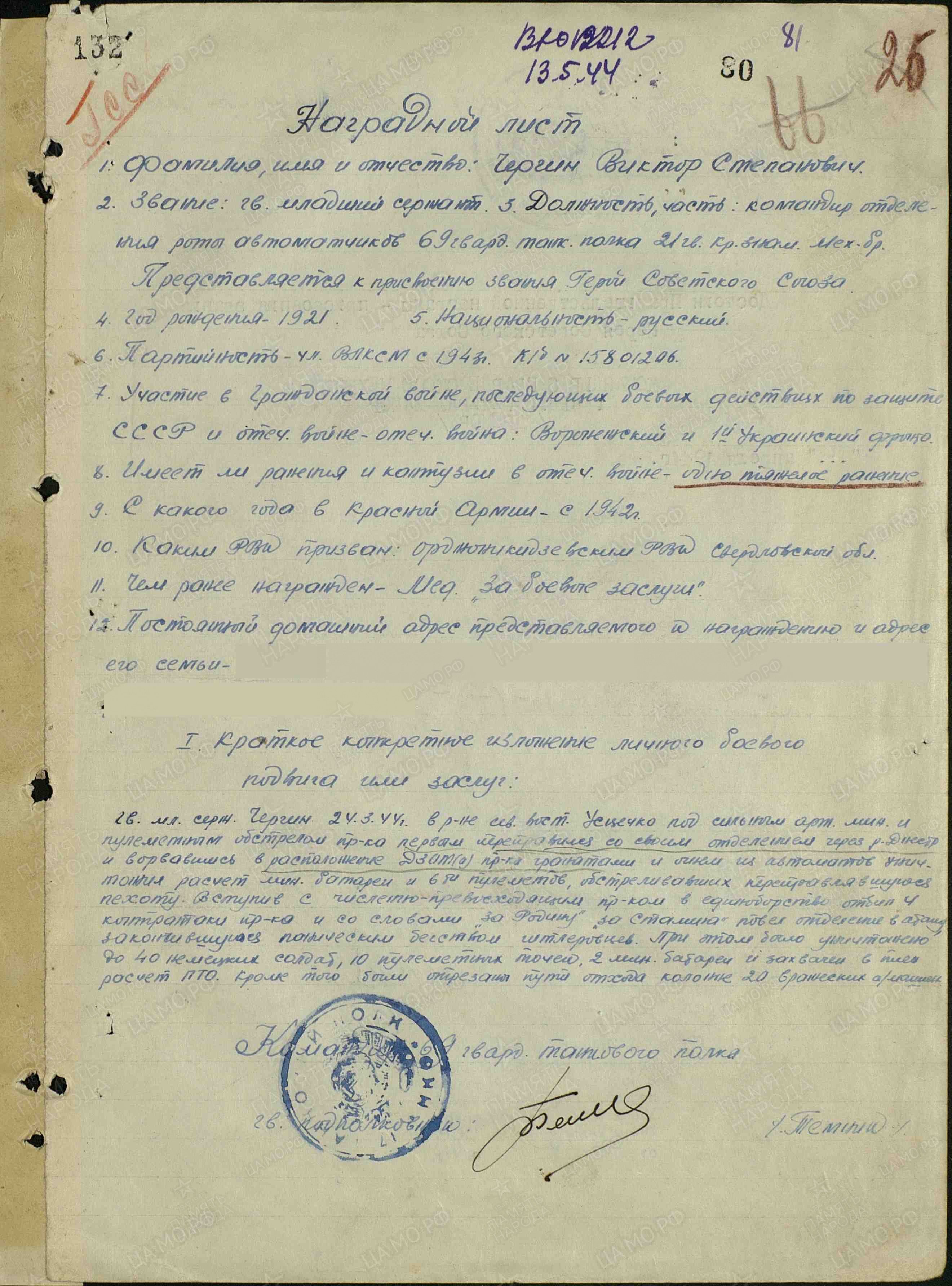 Чергин Виктор Степанович – командир отделения роты автоматчиков 69-го гвардейского танкового полка (21-я гвардейская Краснознаменная механизированная бригада, 8-й гвардейский механизированный корпус, 1-я танковая армия, 1-й Украинский фронт), гвардии младший сержант.