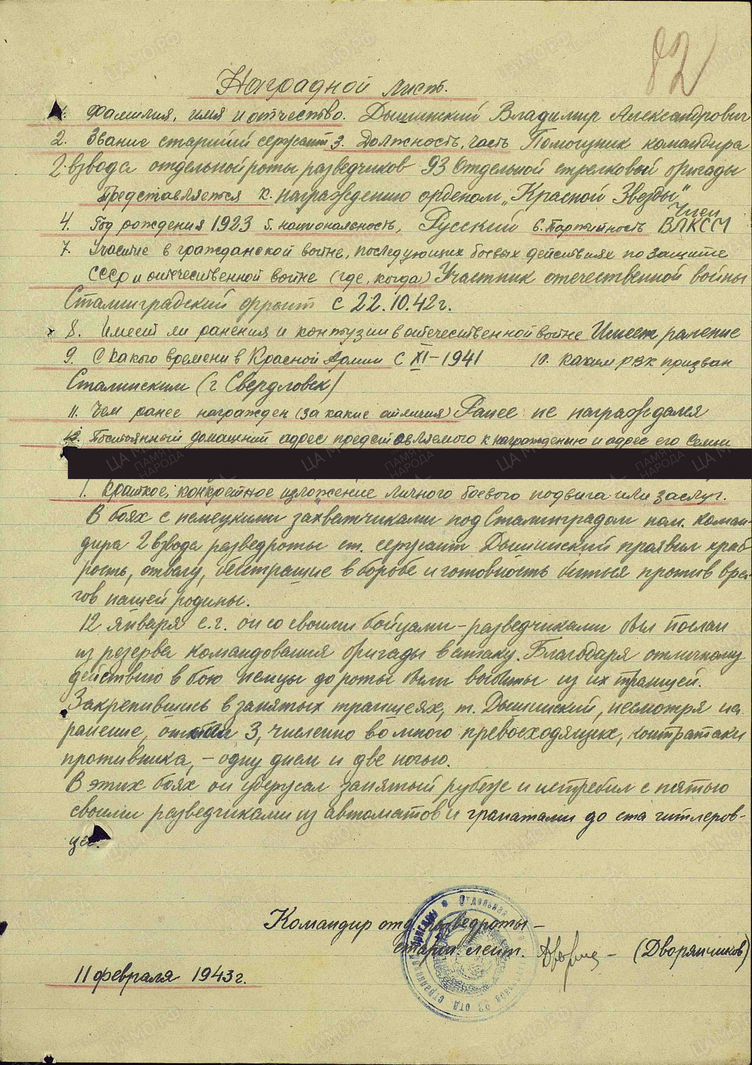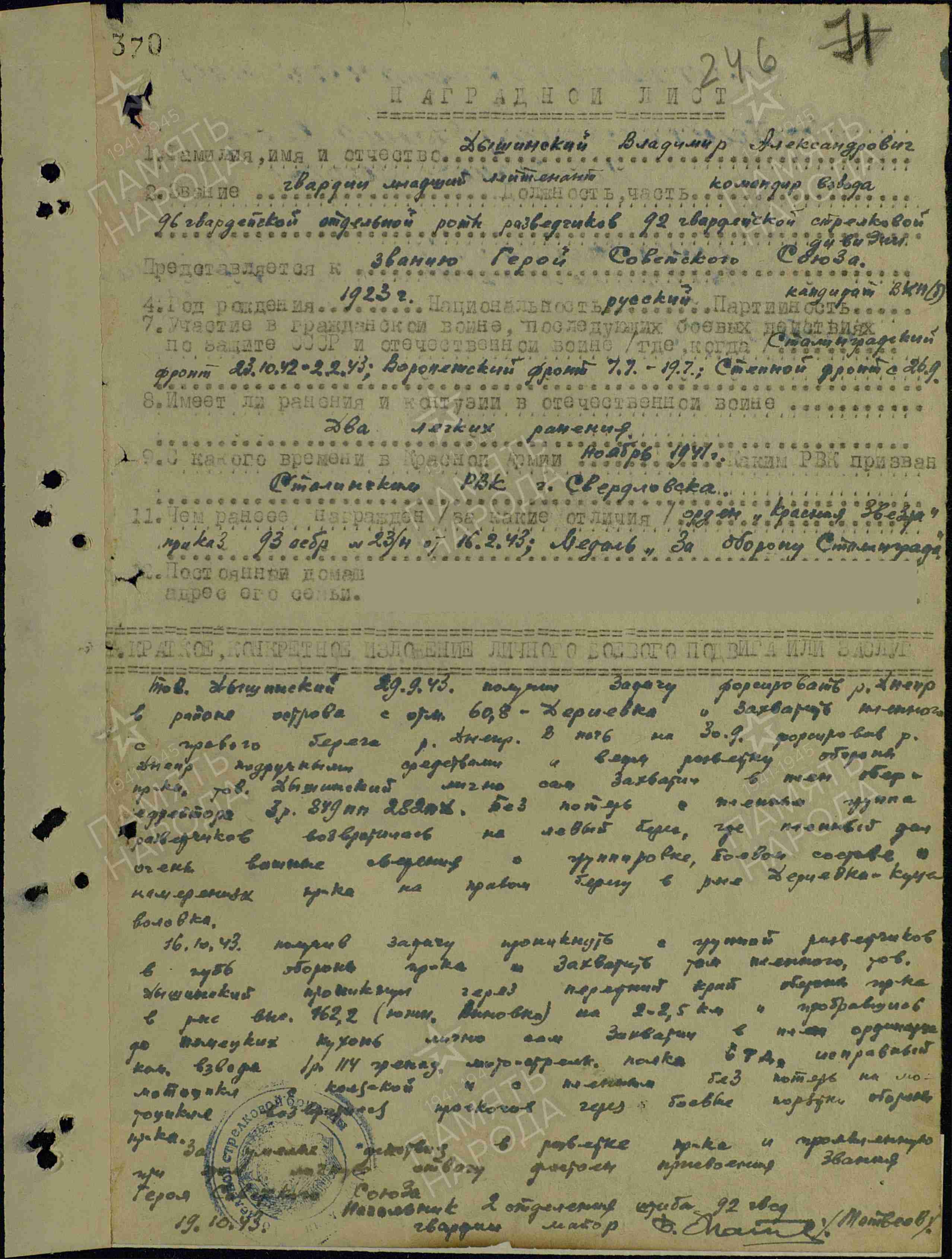 Дышинский Владимир Александрович – командир взвода разведки 96-й гвардейской отдельной разведывательной роты (92-я гвардейская стрелковая дивизия, 37-я армия, Степной фронт) гвардии младший лейтенант.